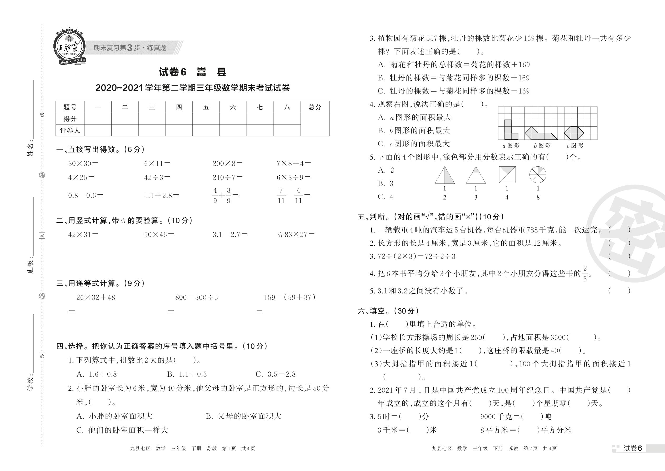 嵩县2020~2021学年第二学期三年级数学期末考试试卷(苏教版)【6】