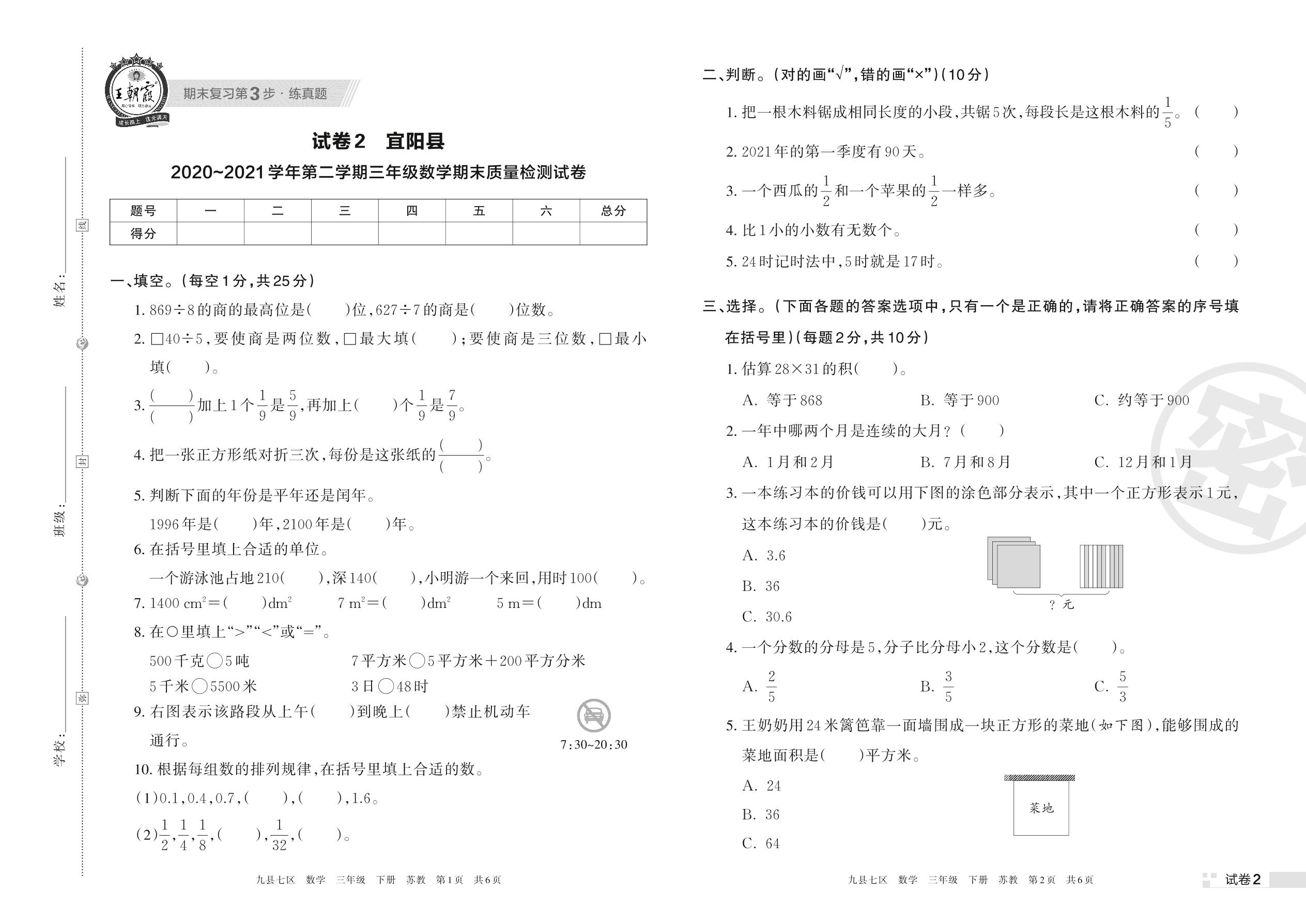 宜阳县2020~2021学年第二学期三年级数学期末质量检测试卷(苏教版)【2】