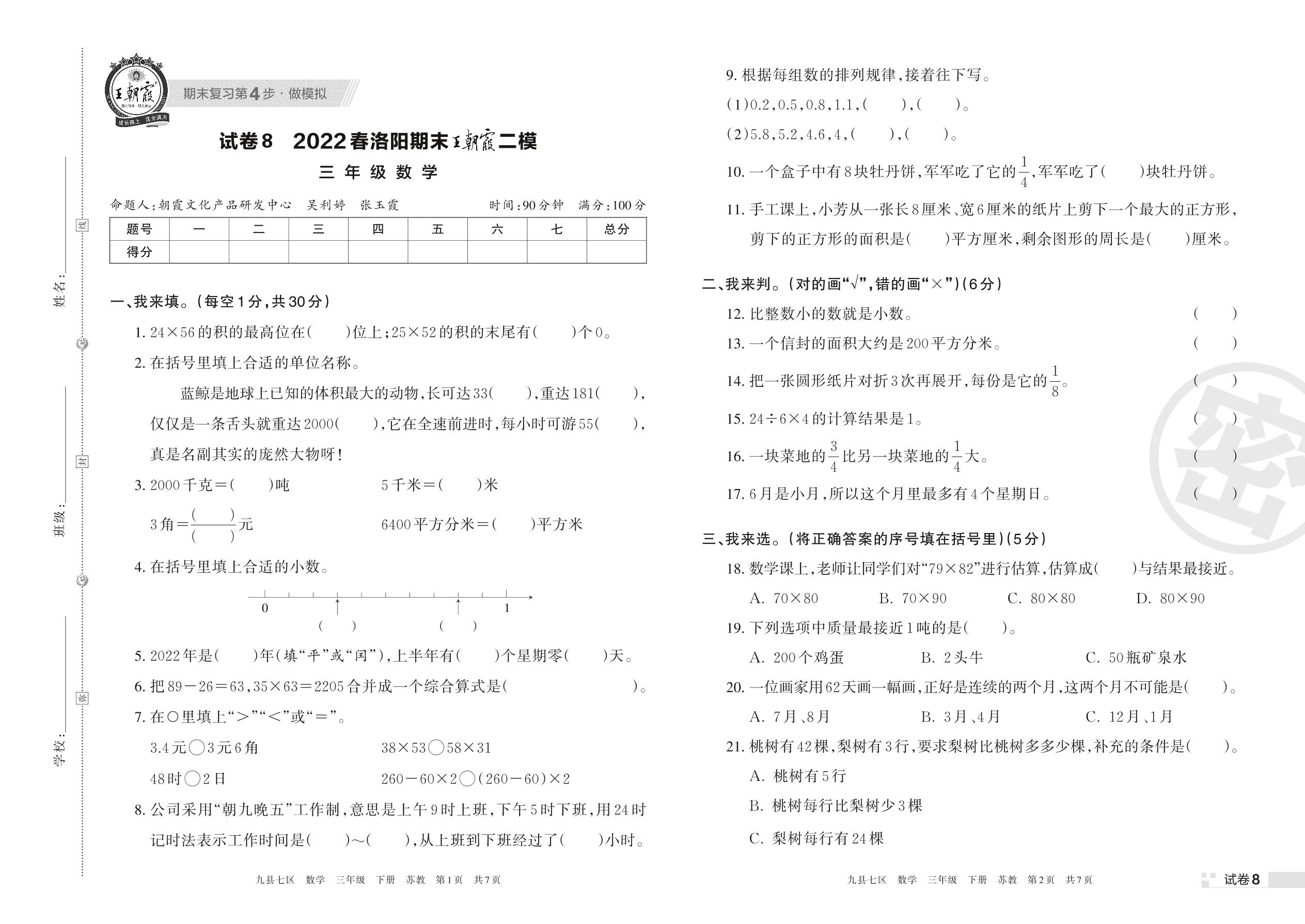 王朝霞期末模拟卷三年级下册数学(苏教版)_R220407153502227【8】