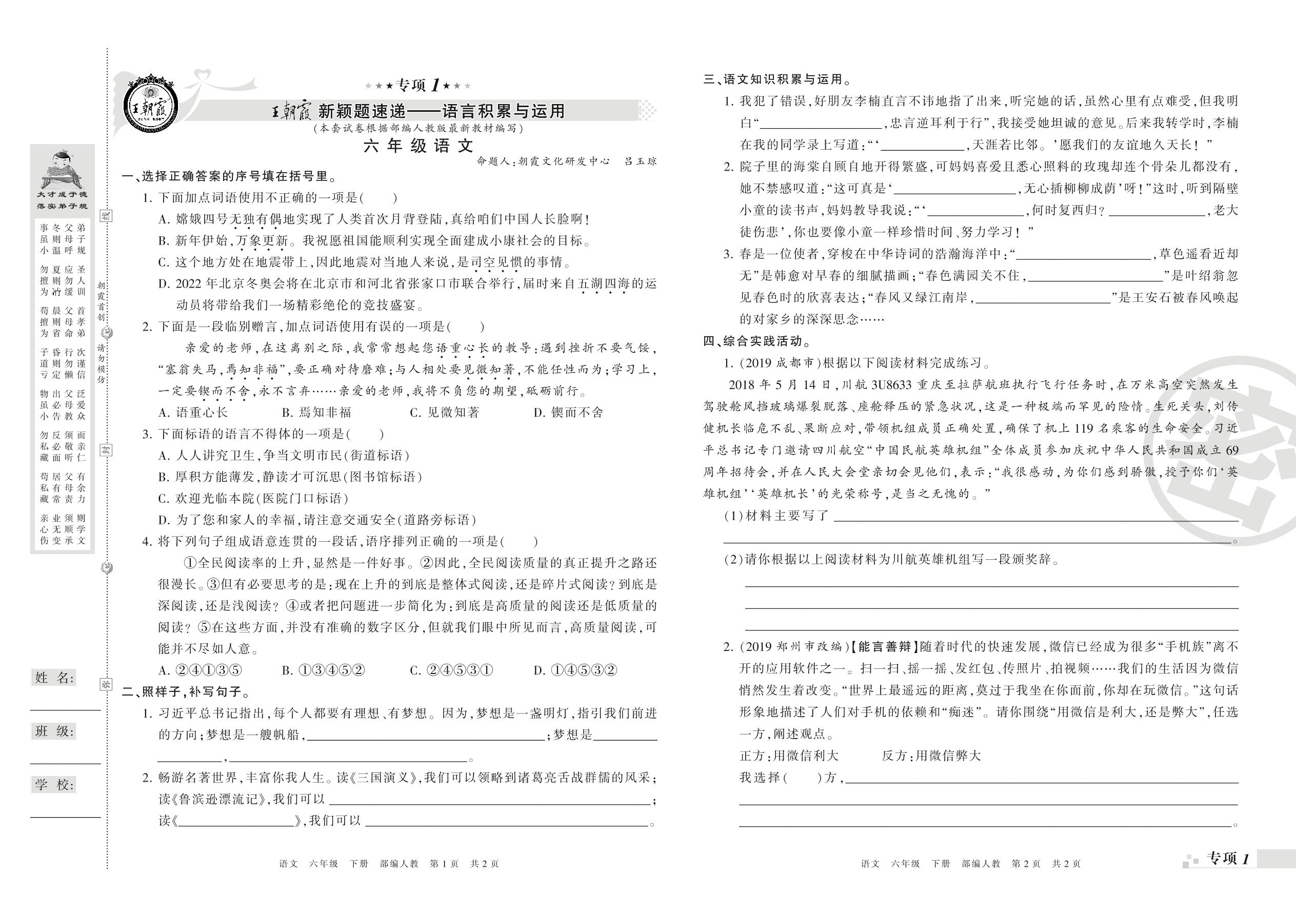 王朝霞期末专项卷——新颖题速递:语言积累与运用、非连续性文本阅读六年级下册语文(人教版)_R21080221319【0】
