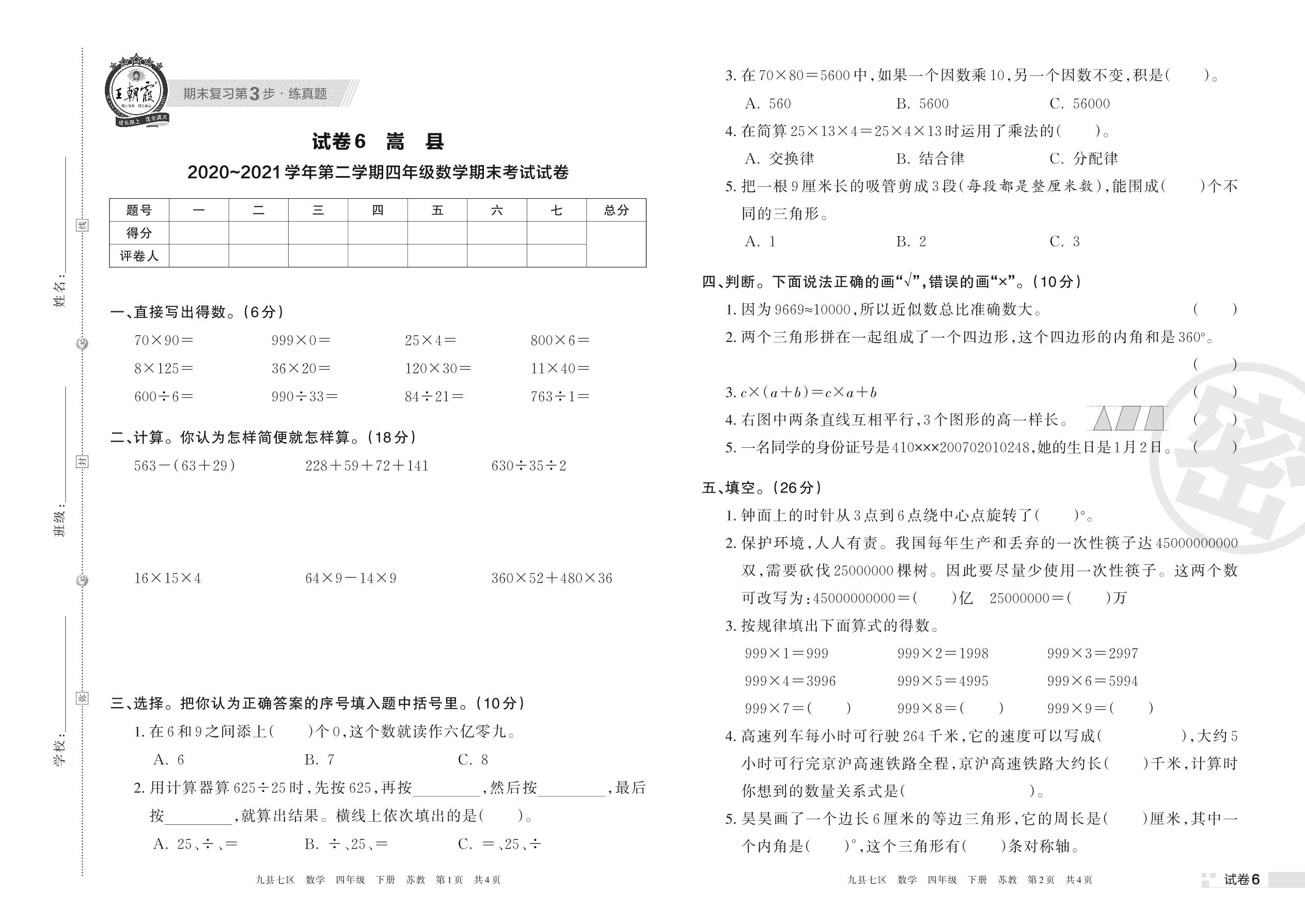 嵩县2020~2021学年第二学期四年级数学期末考试试卷(苏教版)【6】