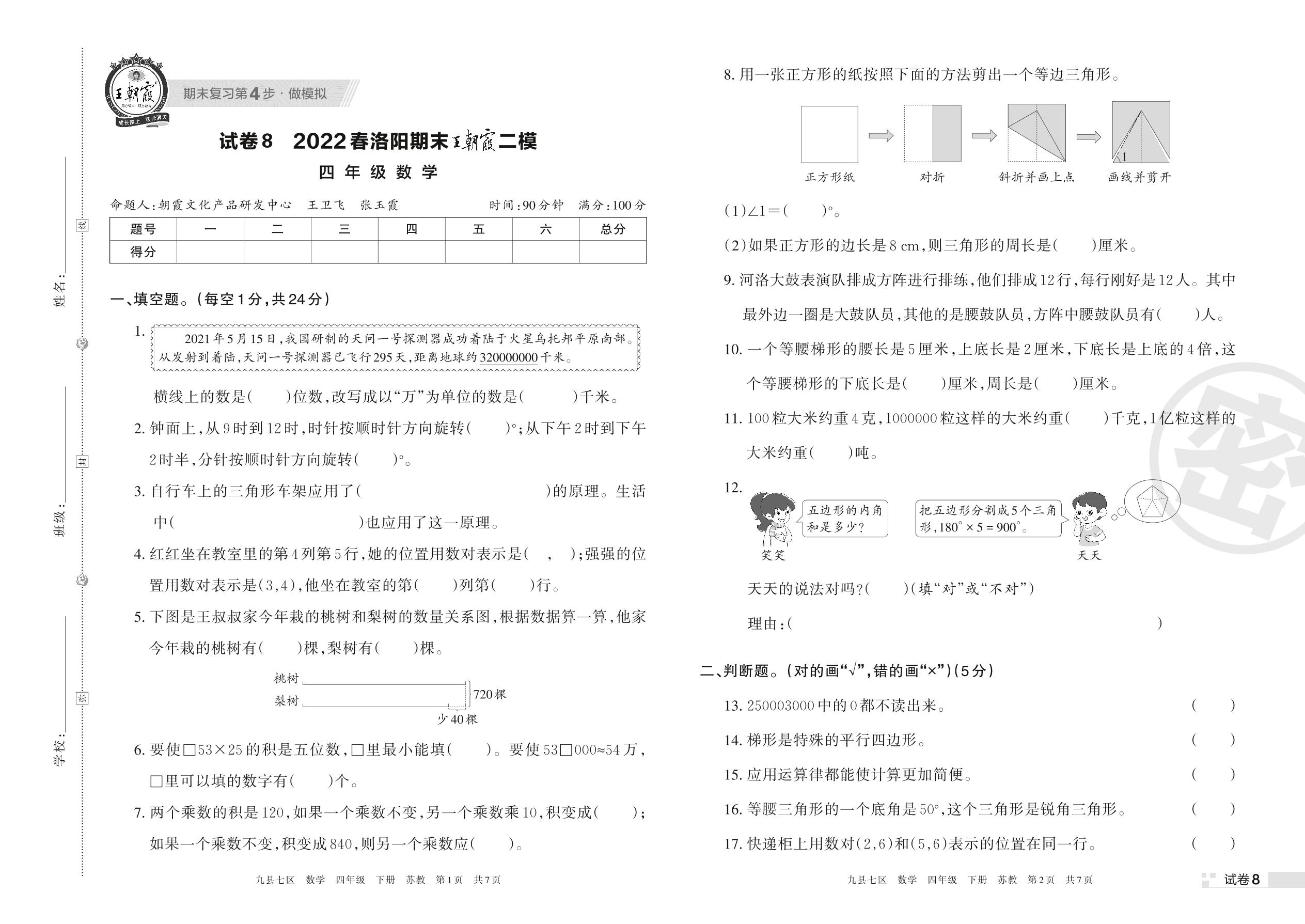 王朝霞期末模拟卷四年级下册数学(苏教版)_R220407154334340【8】