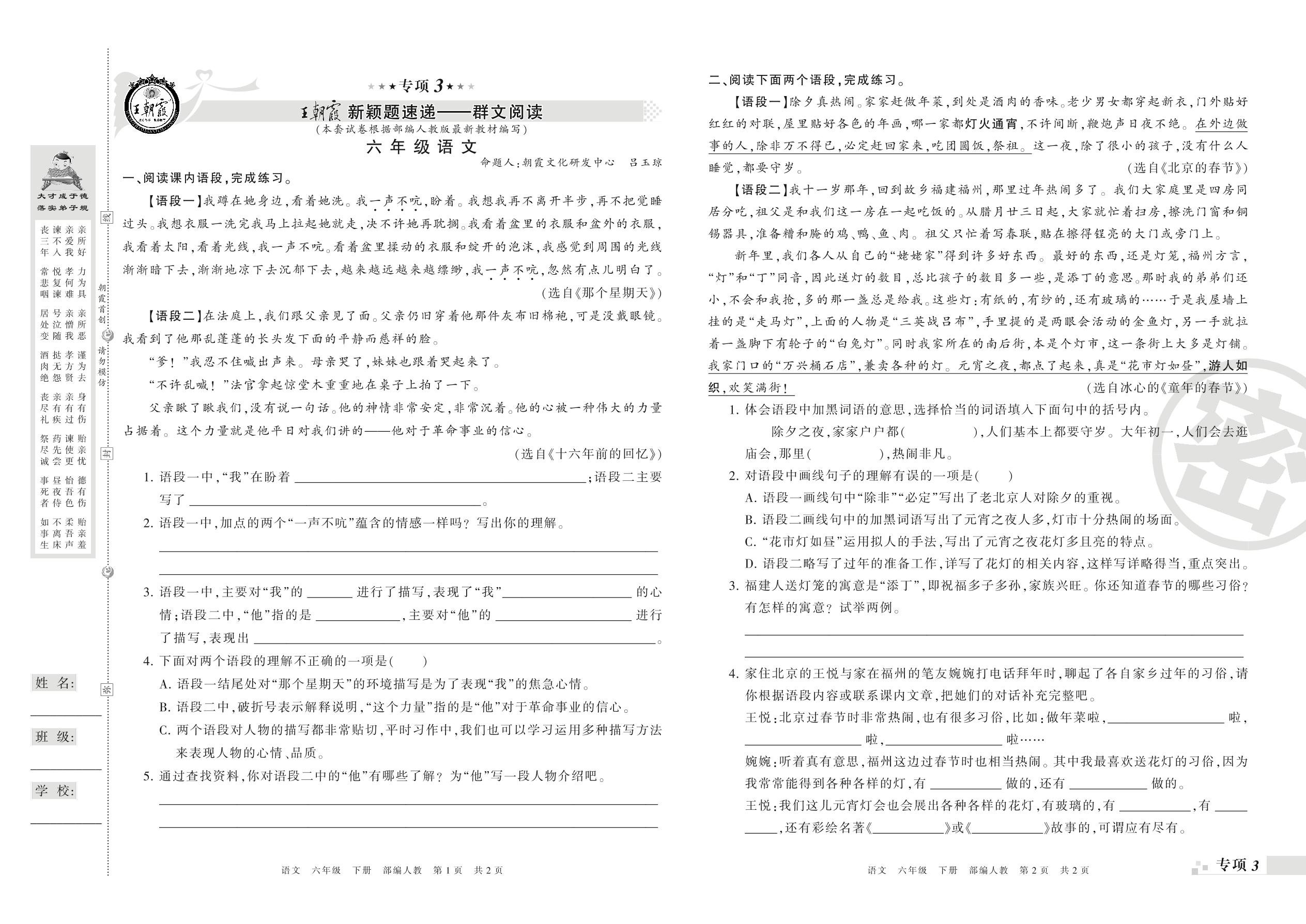 王朝霞期末专项卷——新颖题速递:群文阅读、古诗文阅读六年级下册语文(人教版)_R21080221325【0】