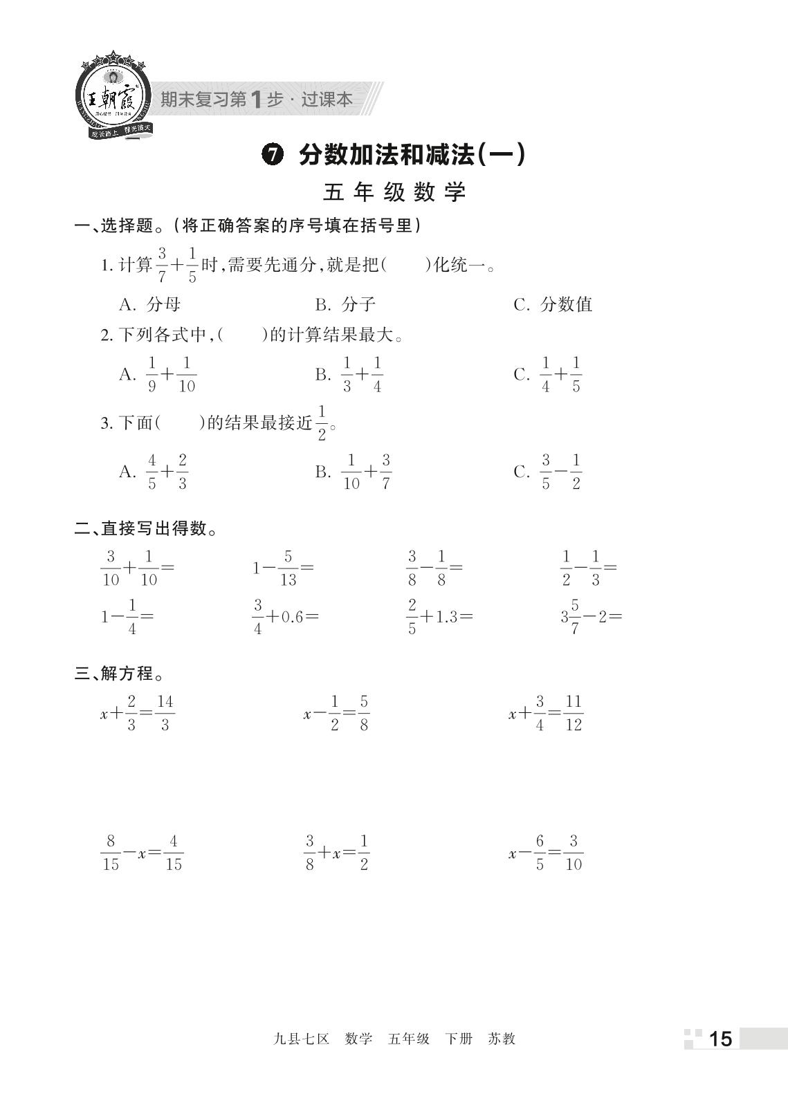 王朝霞期末过课本——7 分数加法和减法(一)五年级下册数学(苏教版)_R220407155043755