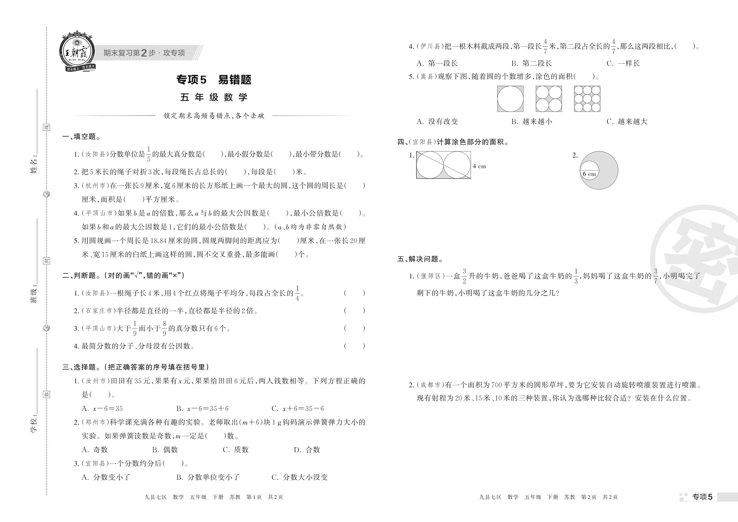 王朝霞期末专项卷——易错题五年级下册数学(苏教版)_R220407155044030【5】