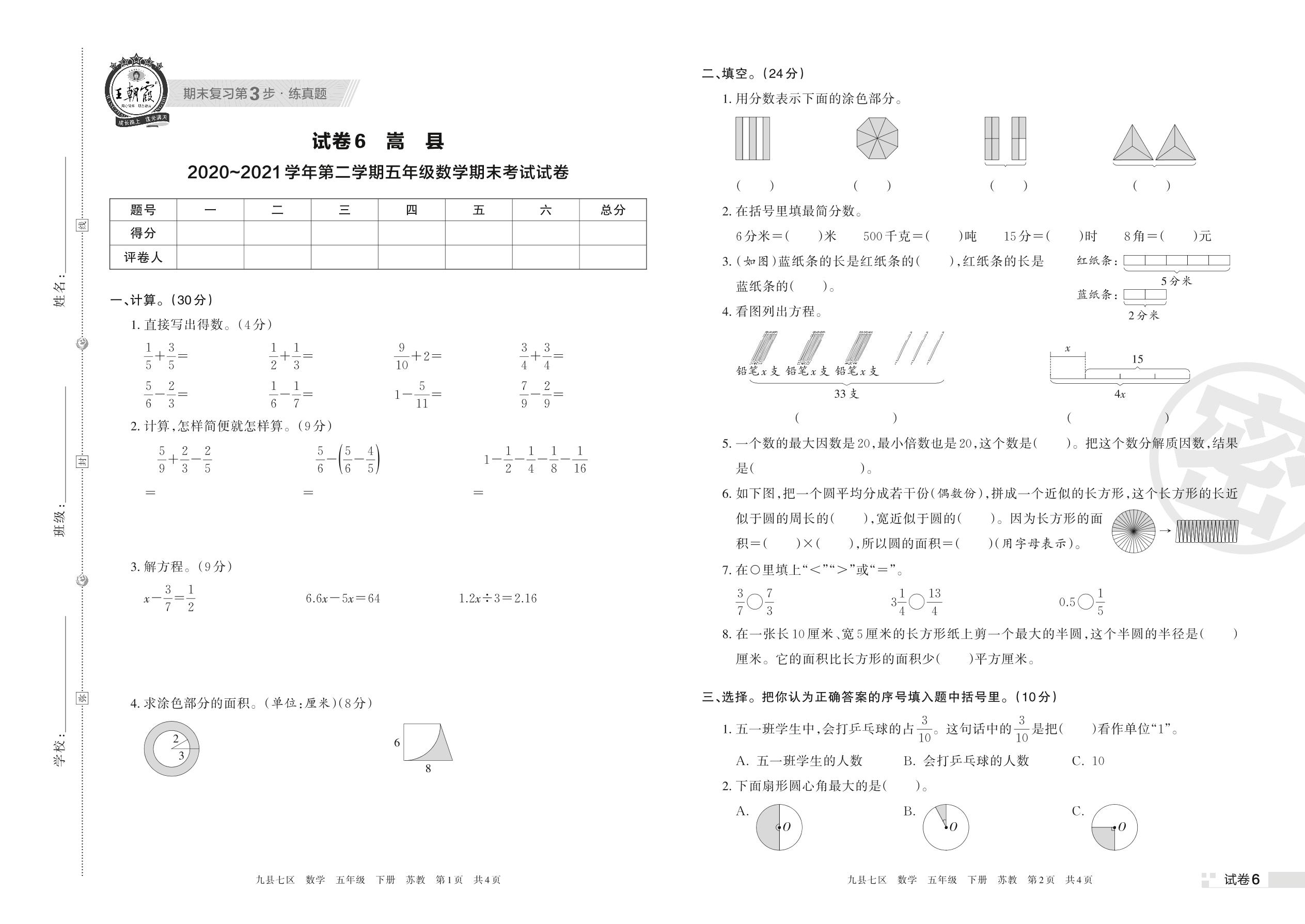 嵩县2020~2021学年第二学期五年级数学期末考试试卷(苏教版)【6】