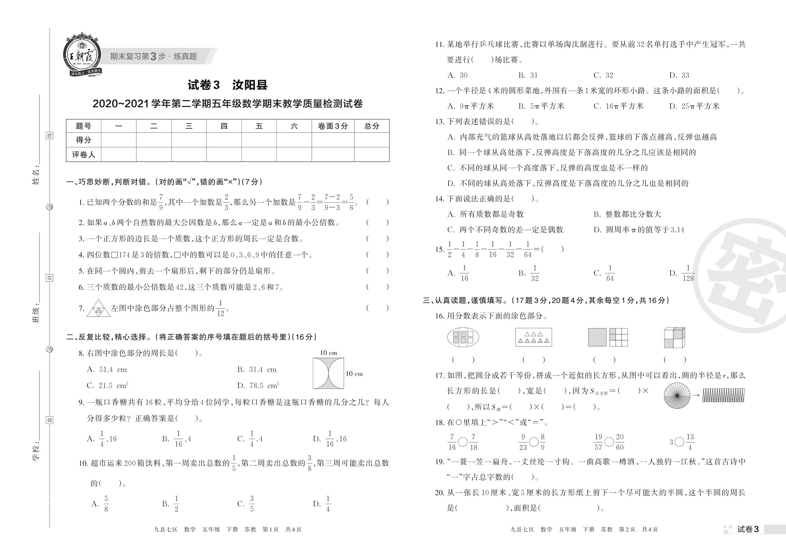 汝阳县2020~2021学年第二学期五年级数学期末教学质量检测试卷(苏教版)【3】