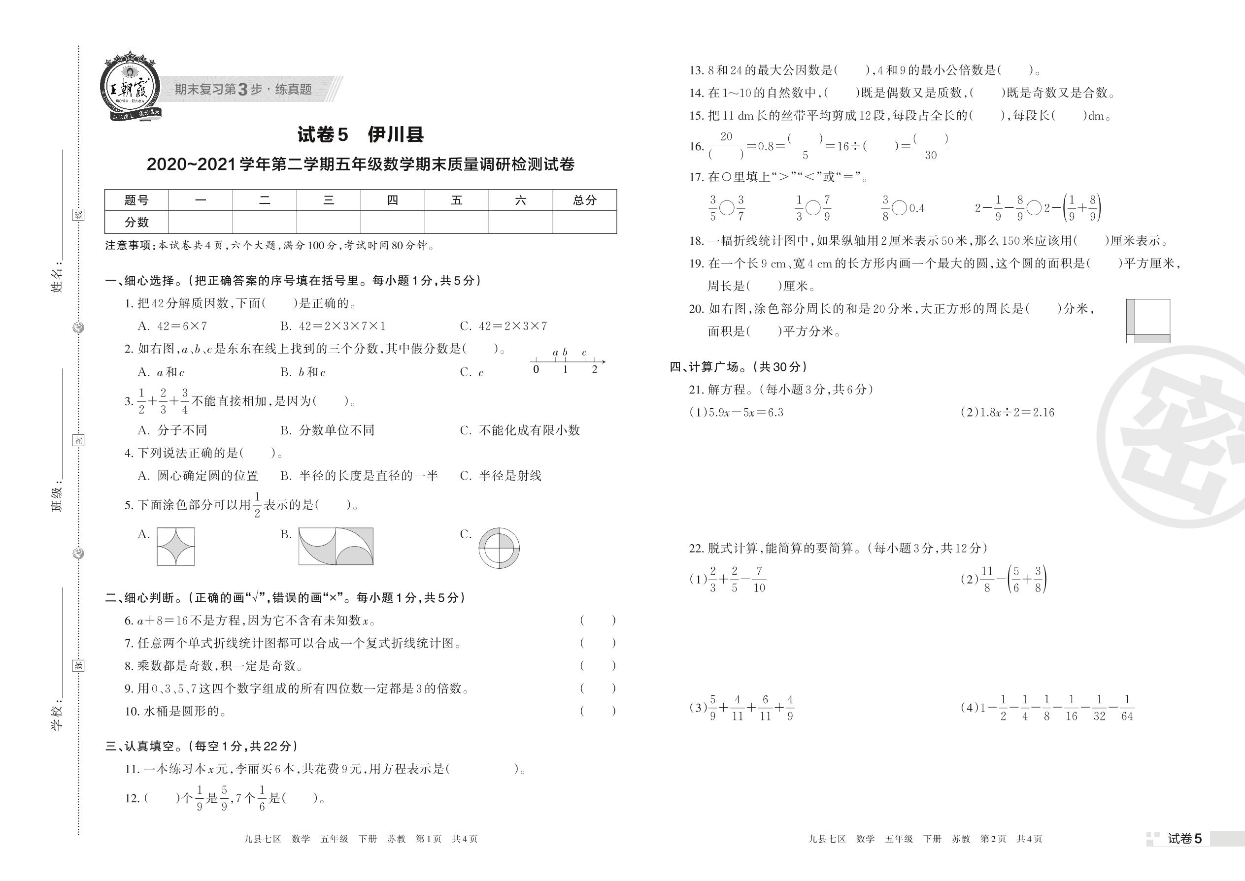 伊川县2020~2021学年第二学期五年级数学期末质量调研检测试卷(苏教版)【5】