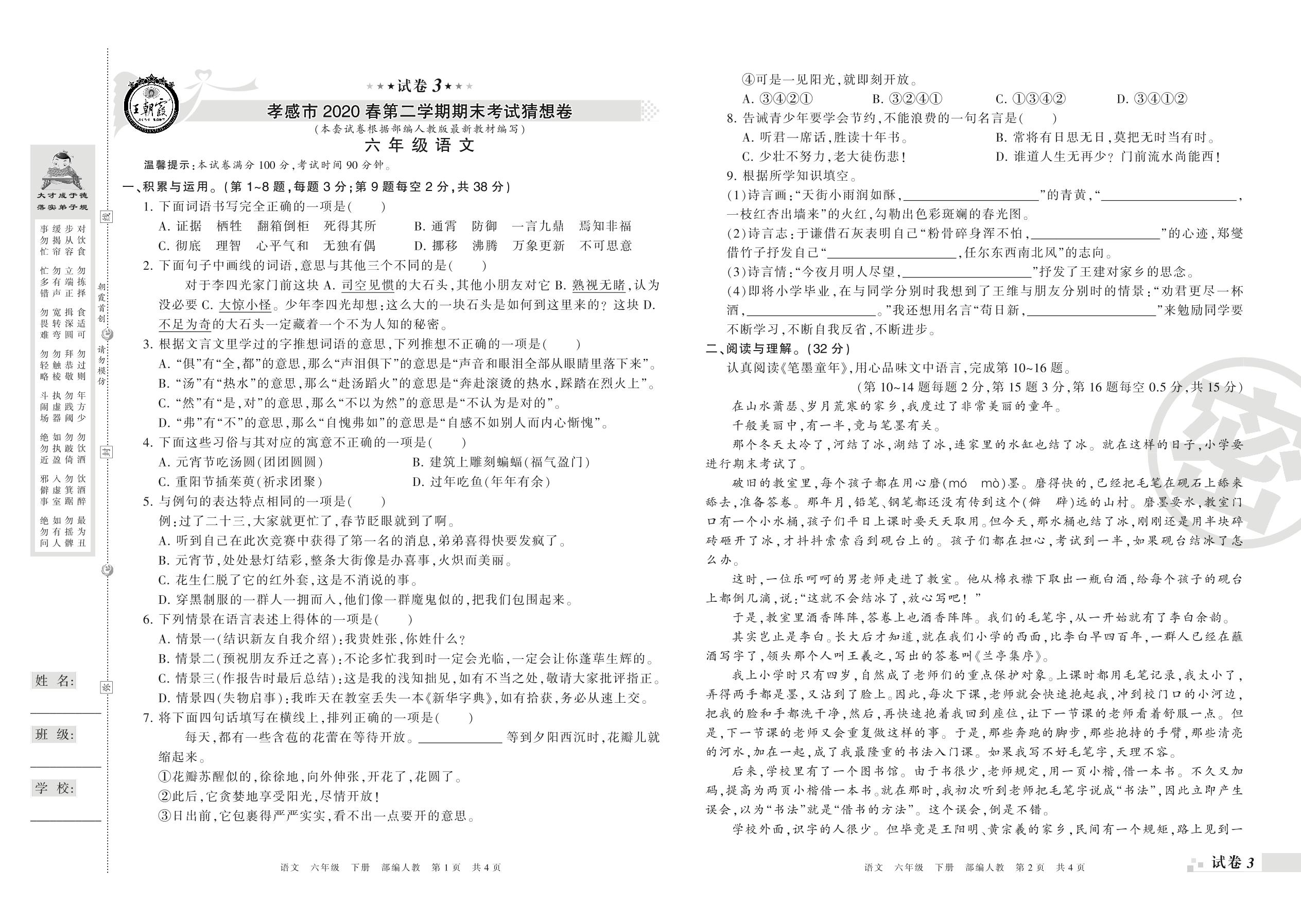 2018-2019学年第二学期孝感市猜想卷六年级语文试卷(人教版)【3】