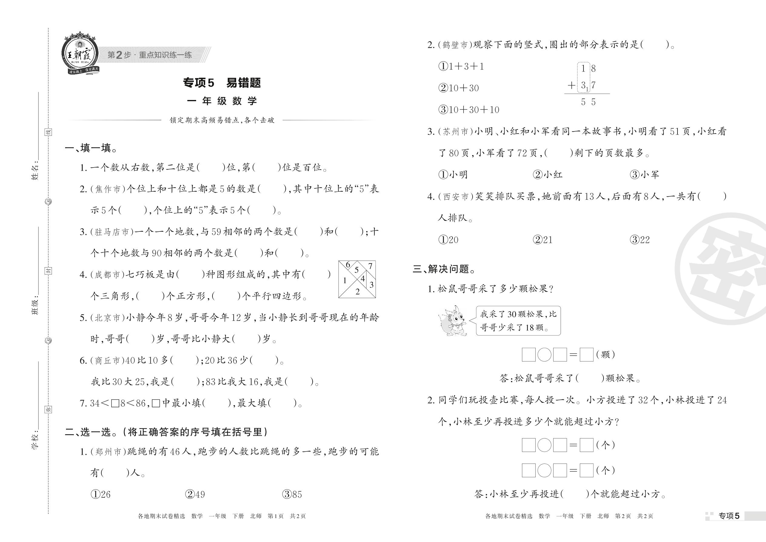 王朝霞期末专项卷——易错题一年级下册数学(北师版)【5】