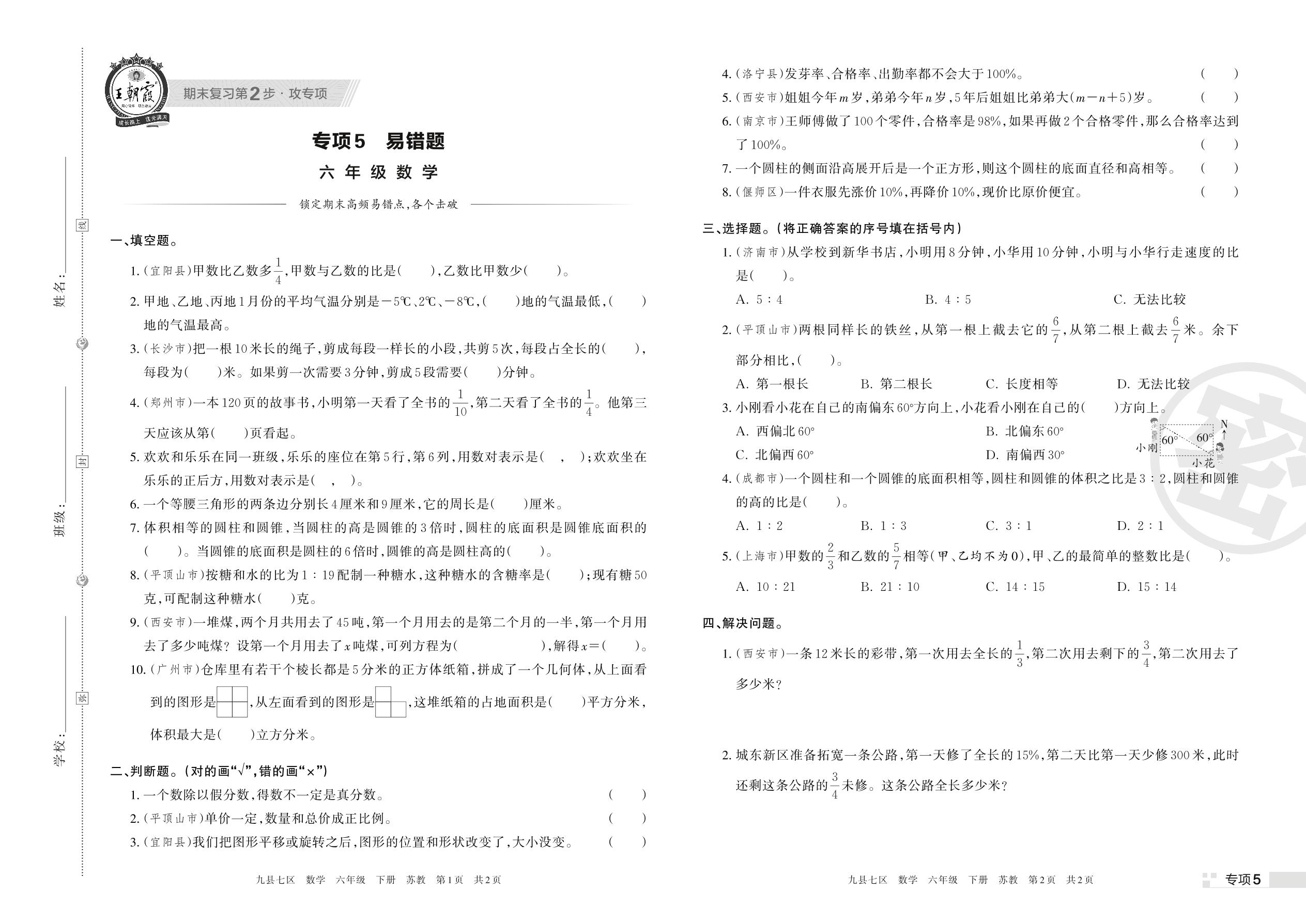 王朝霞期末专项卷——易错题六年级下册数学(苏教版)_R220407155719203【5】
