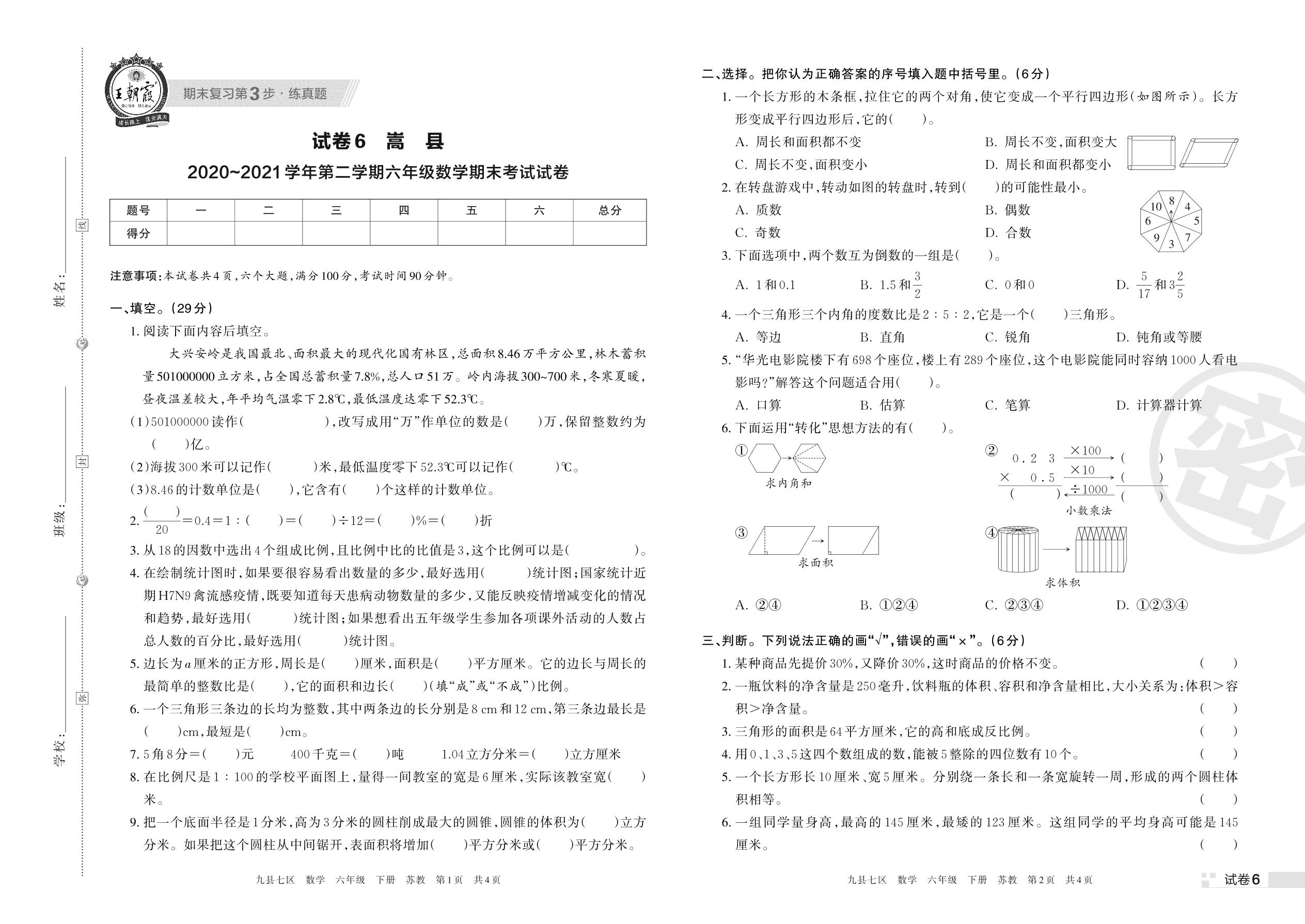 嵩县2020~2021学年第二学期六年级数学期末考试试卷(苏教版)【6】