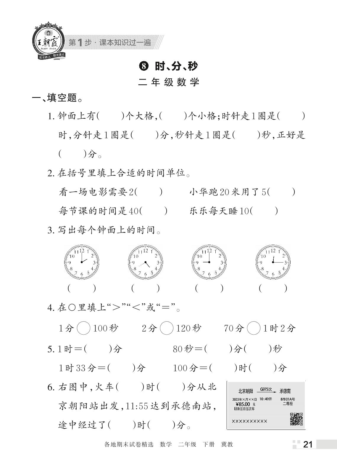 王朝霞期末过课本——8 时、分、秒二年级下册数学(冀教版)
