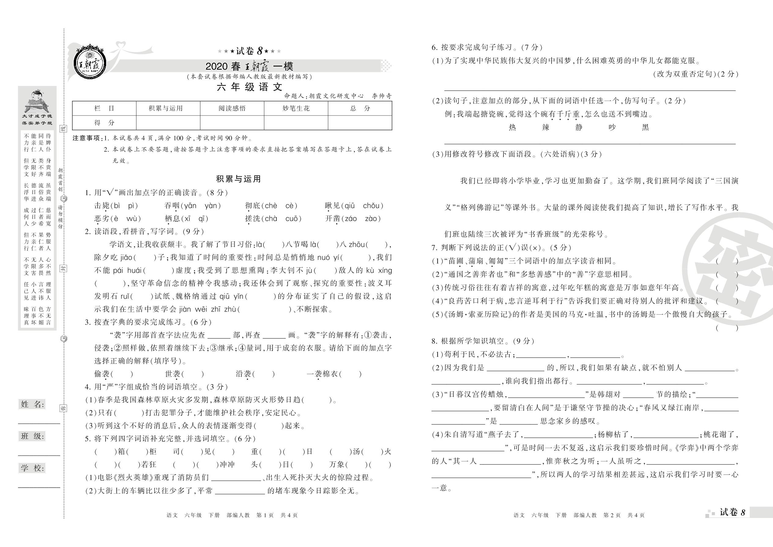 王朝霞期末模拟卷六年级下册语文(人教版)_R21080221359【8】