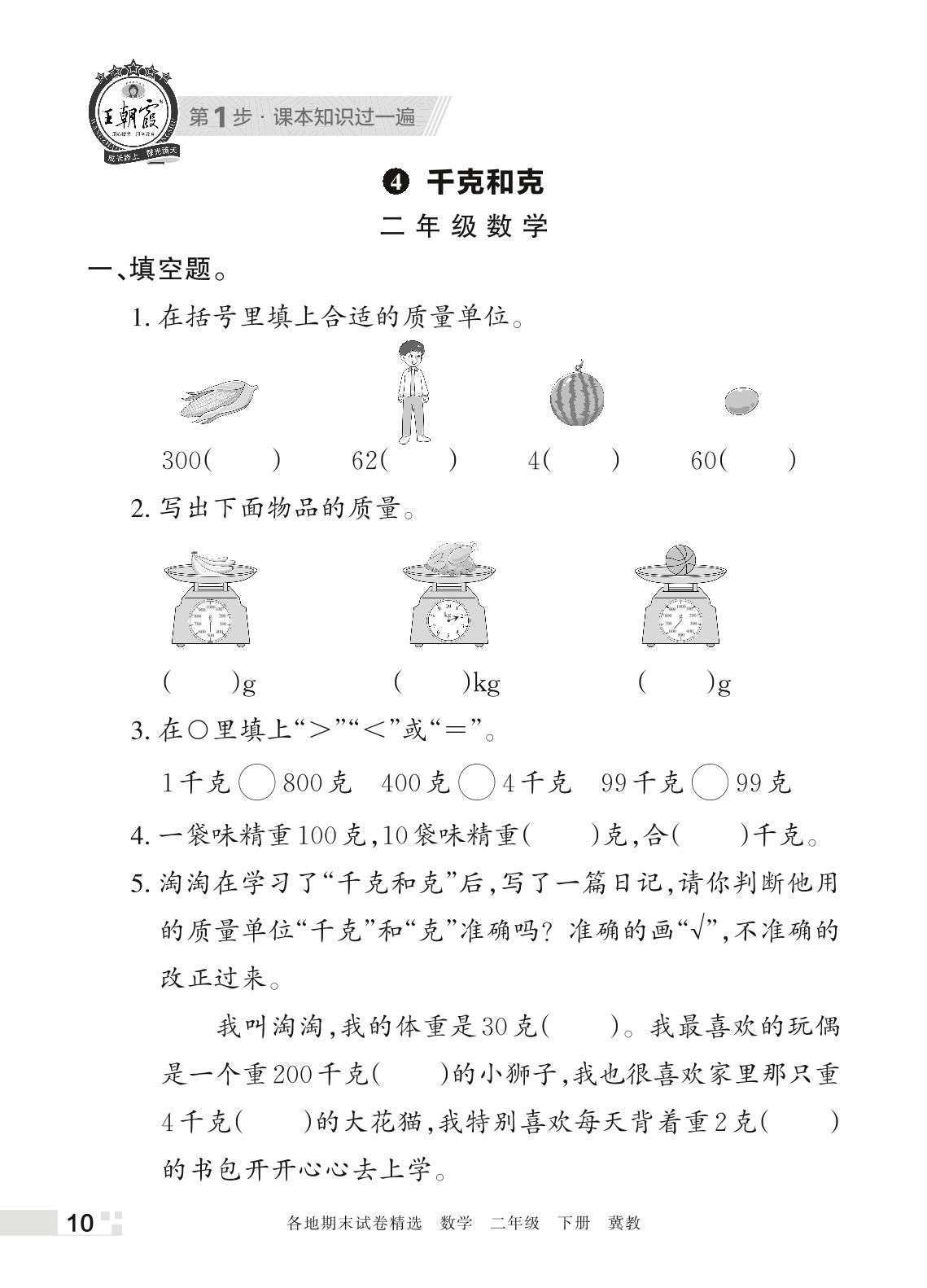 王朝霞期末过课本——4 千克和克二年级下册数学(冀教版)