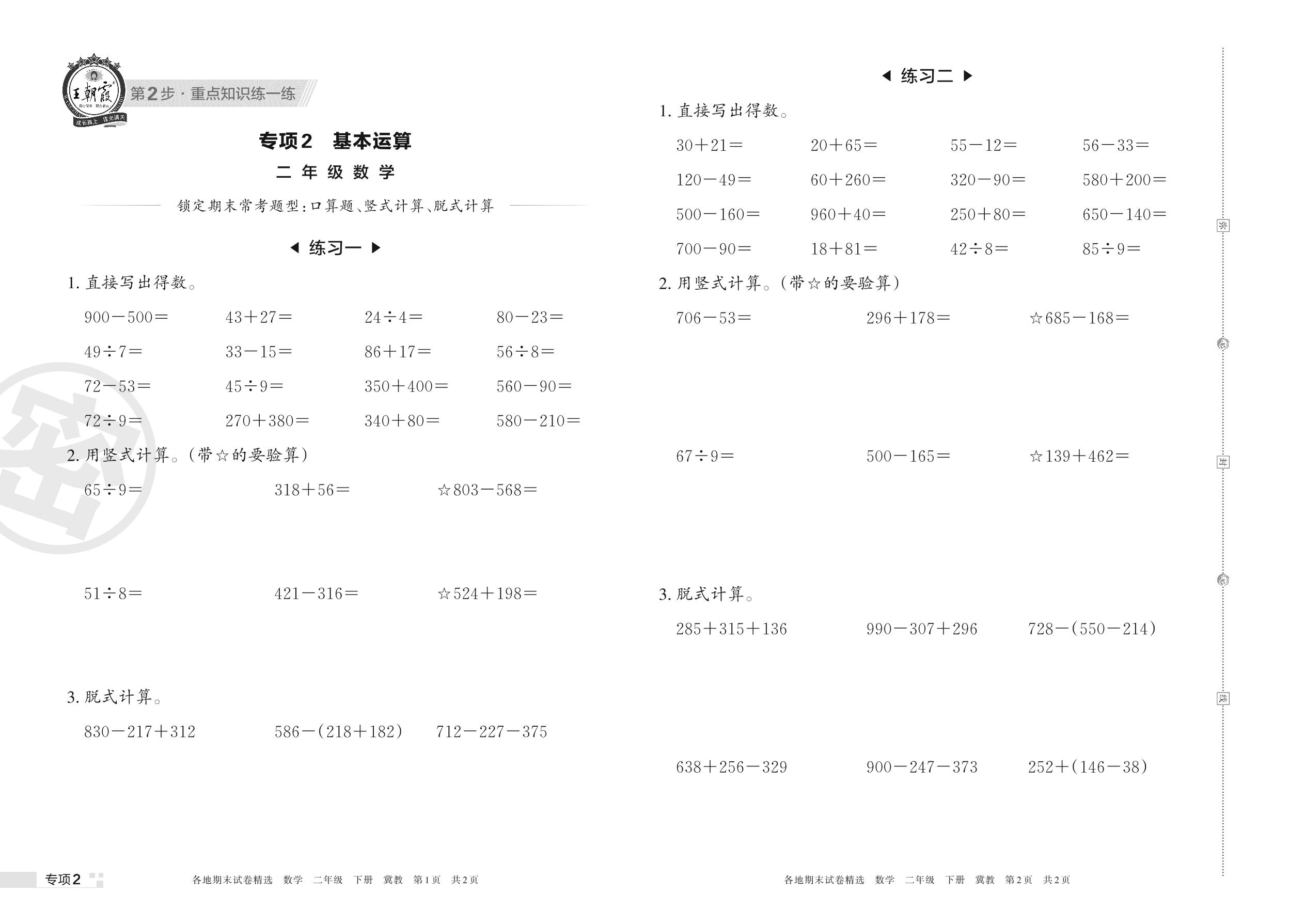 王朝霞期末专项卷——基本运算二年级下册数学(冀教版)【2】