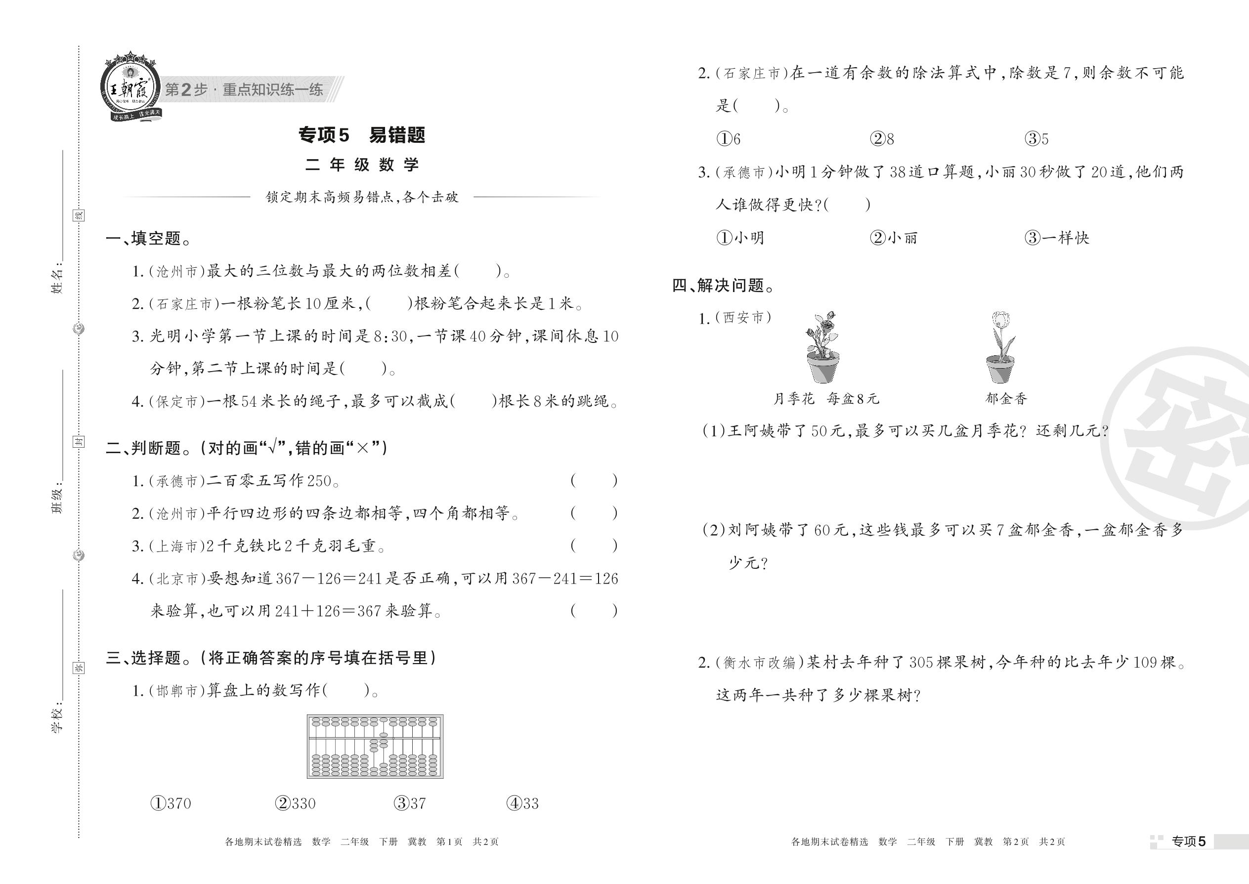 王朝霞期末专项卷——易错题二年级下册数学(冀教版)【5】
