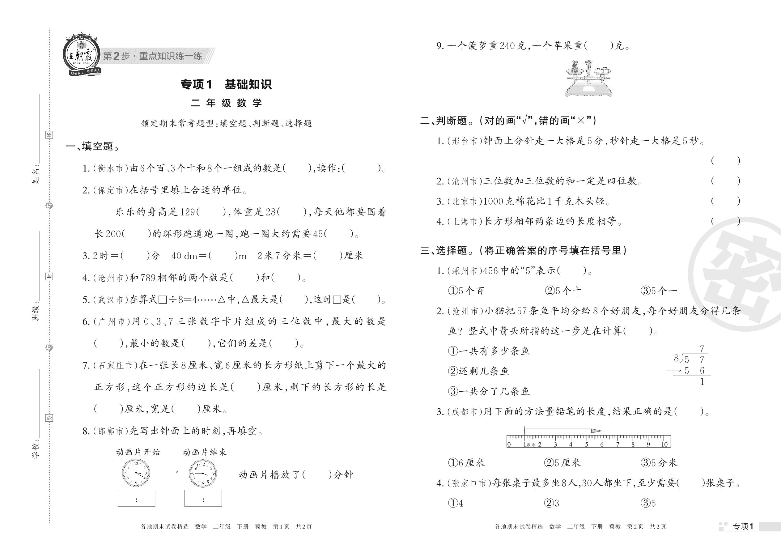 王朝霞期末专项卷——基础知识二年级下册数学(冀教版)【1】6262061
