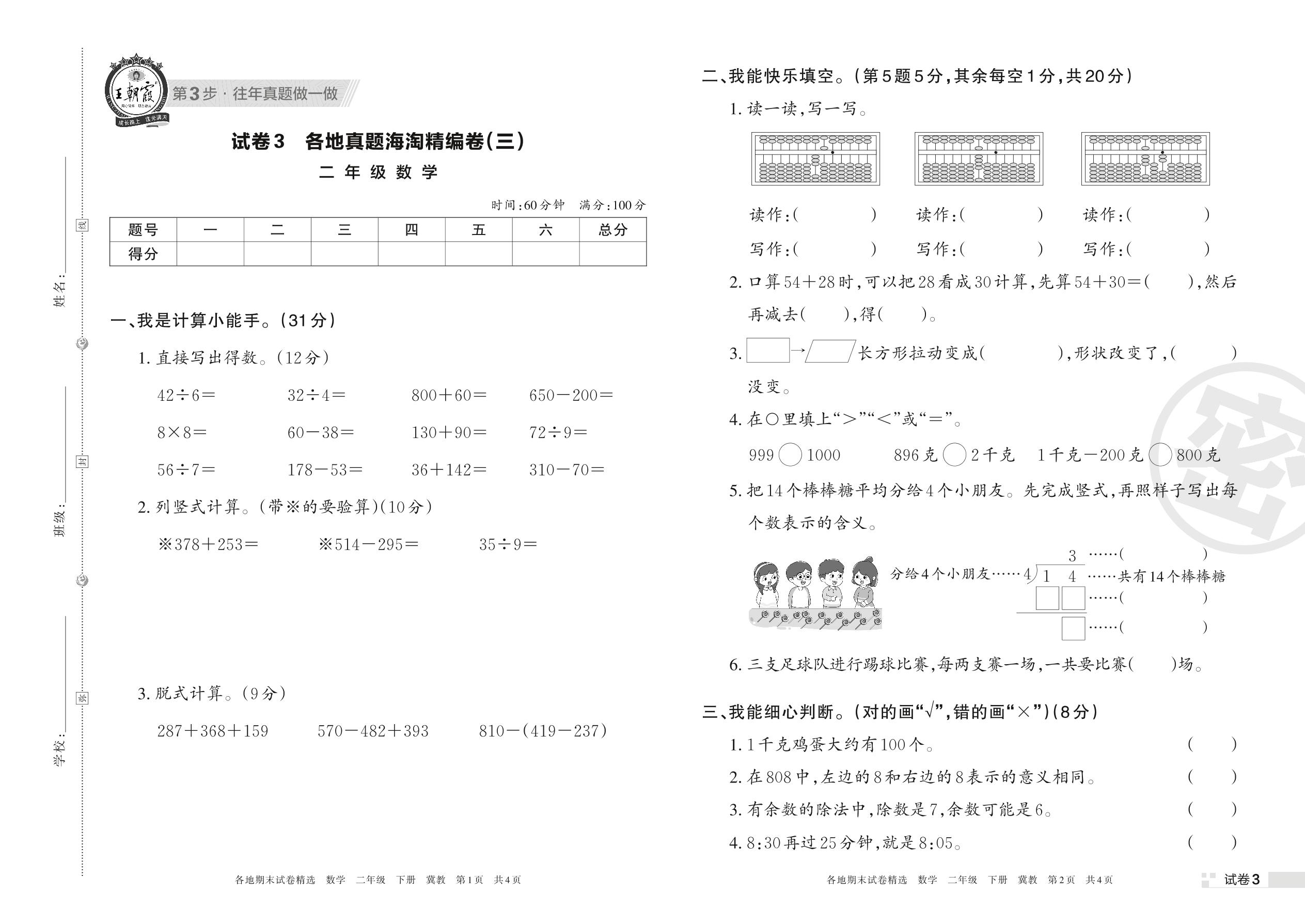 各地真题海淘精编卷(三)二年级下册数学(冀教版)【3】