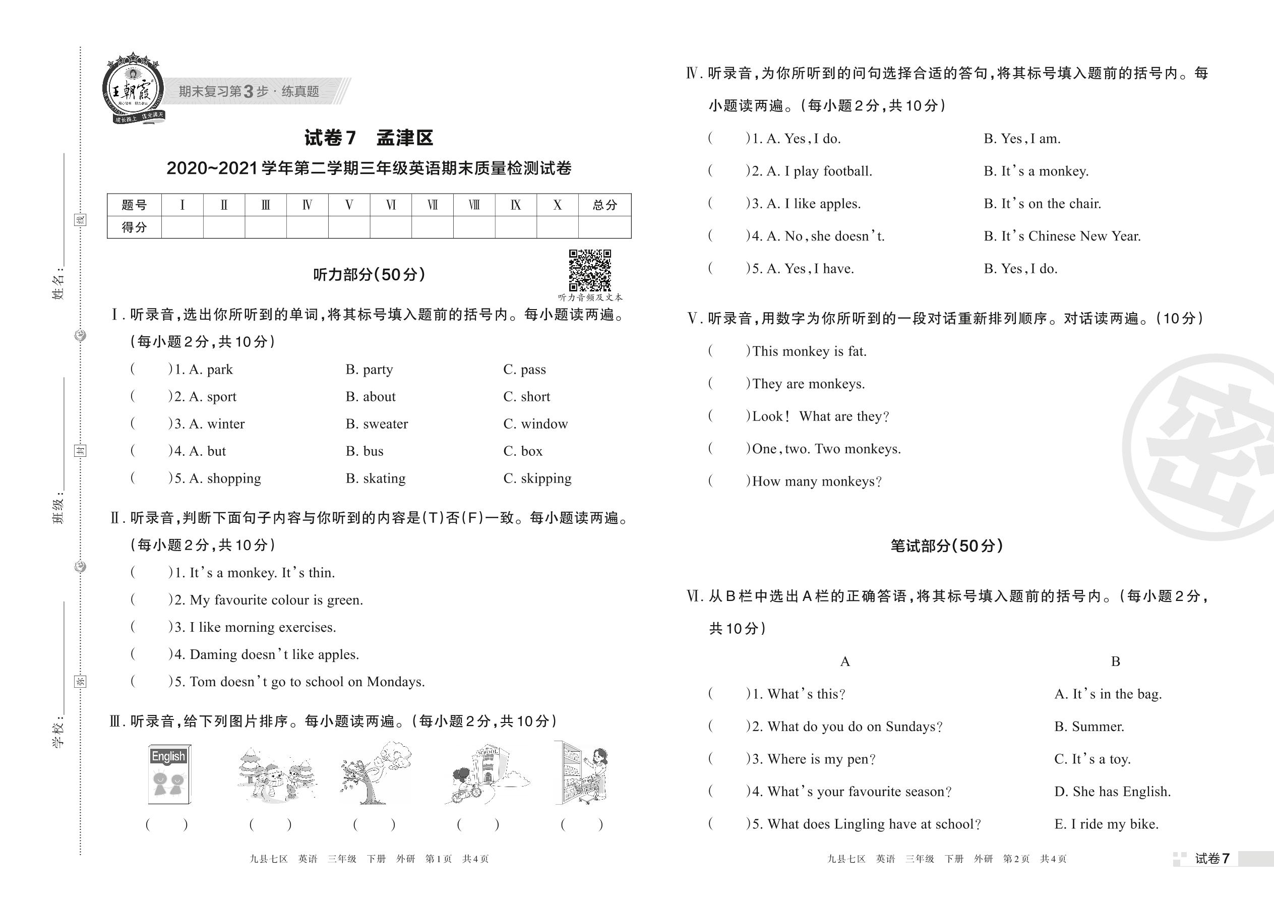 孟津区2020~2021学年第二学期三年级英语期末质量检测试卷(外研版)【7】