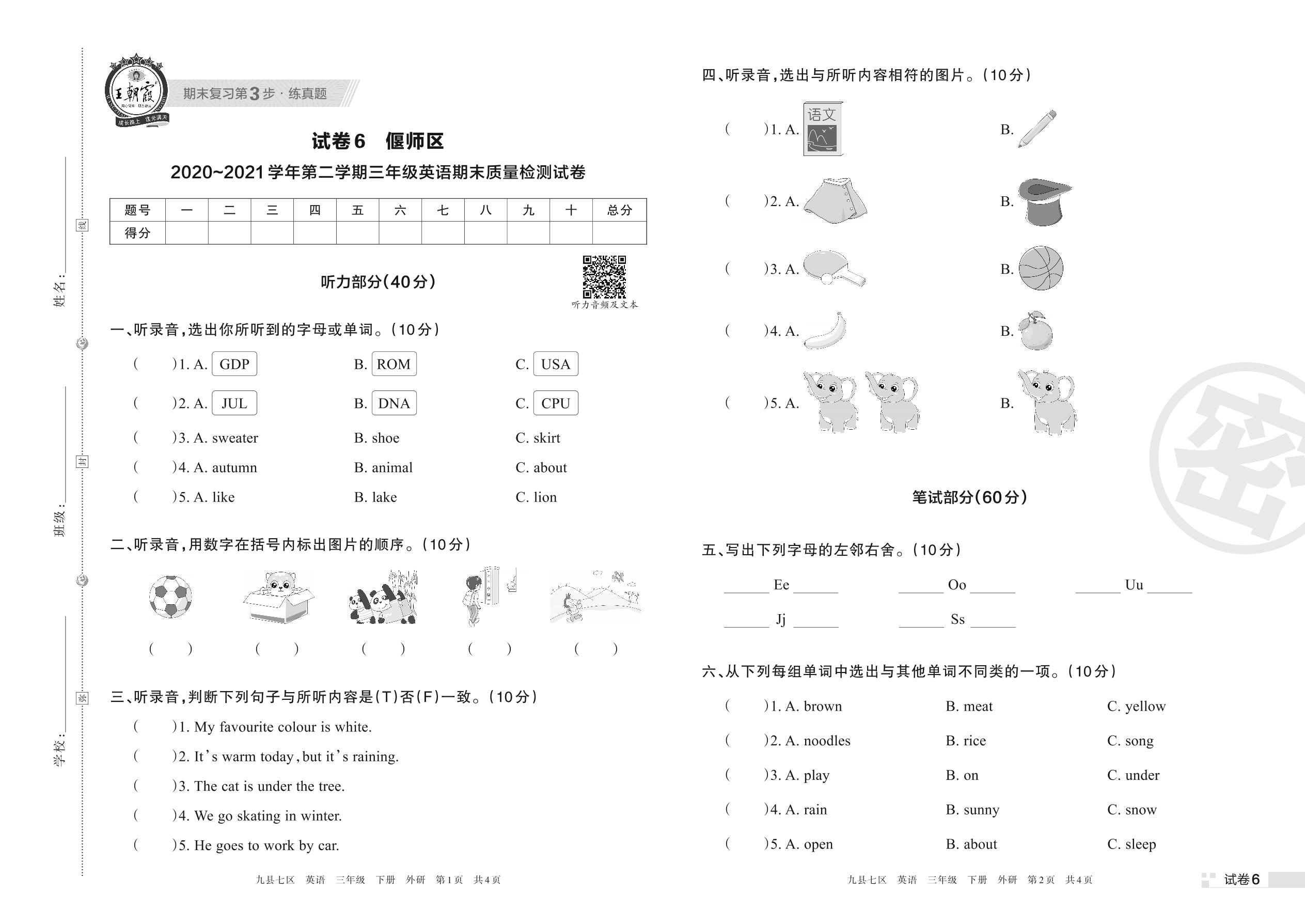 偃师区2020~2021学年第二学期三年级英语期末质量检测试卷(外研版)【6】