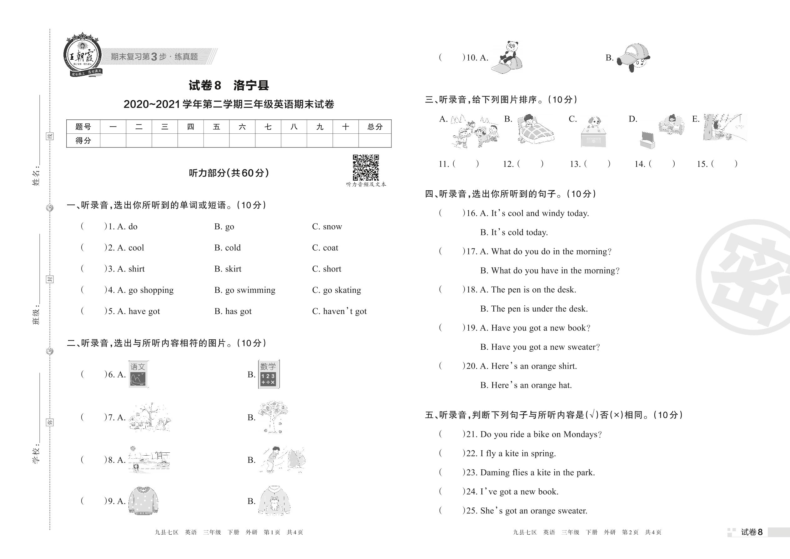 洛宁县2020~2021学年第二学期三年级英语期末试卷(外研版)【8】