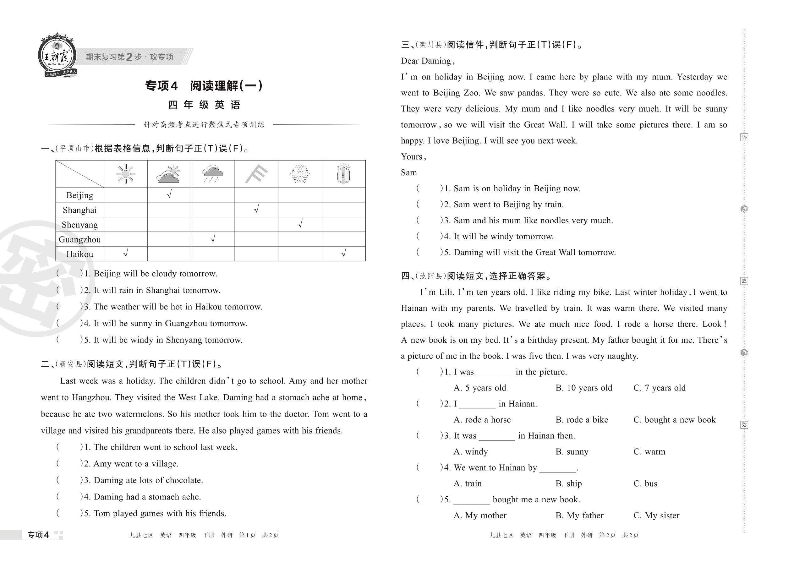 王朝霞期末专项卷——阅读理解(一)四年级下册英语(外研版)【4】