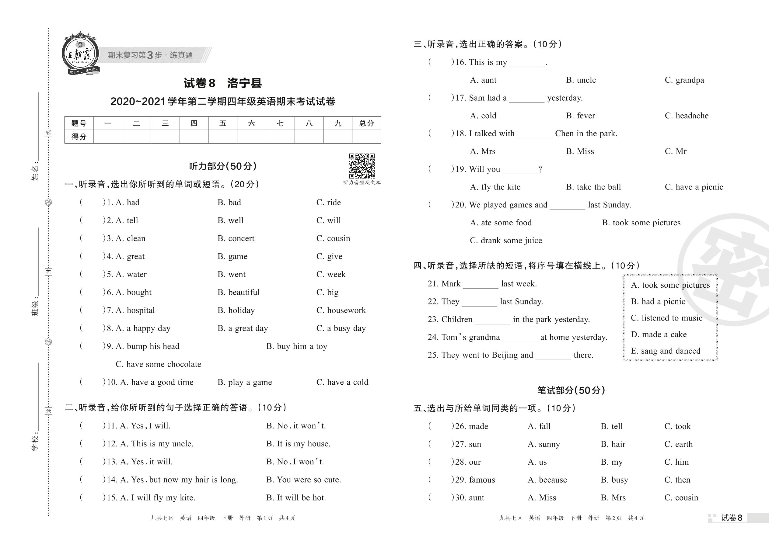 洛宁县2020~2021学年第二学期四年级英语期末考试试卷(外研版)【8】