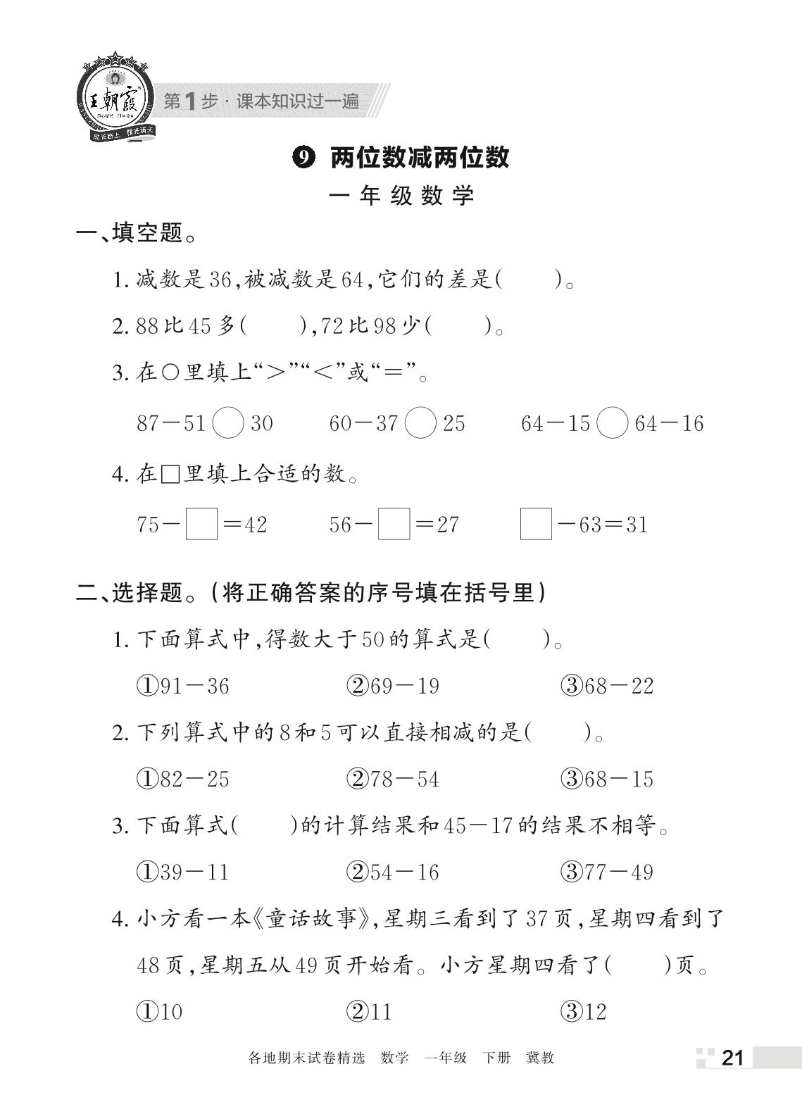 王朝霞期末过课本——9 两位数减两位数一年级下册数学(冀教版)