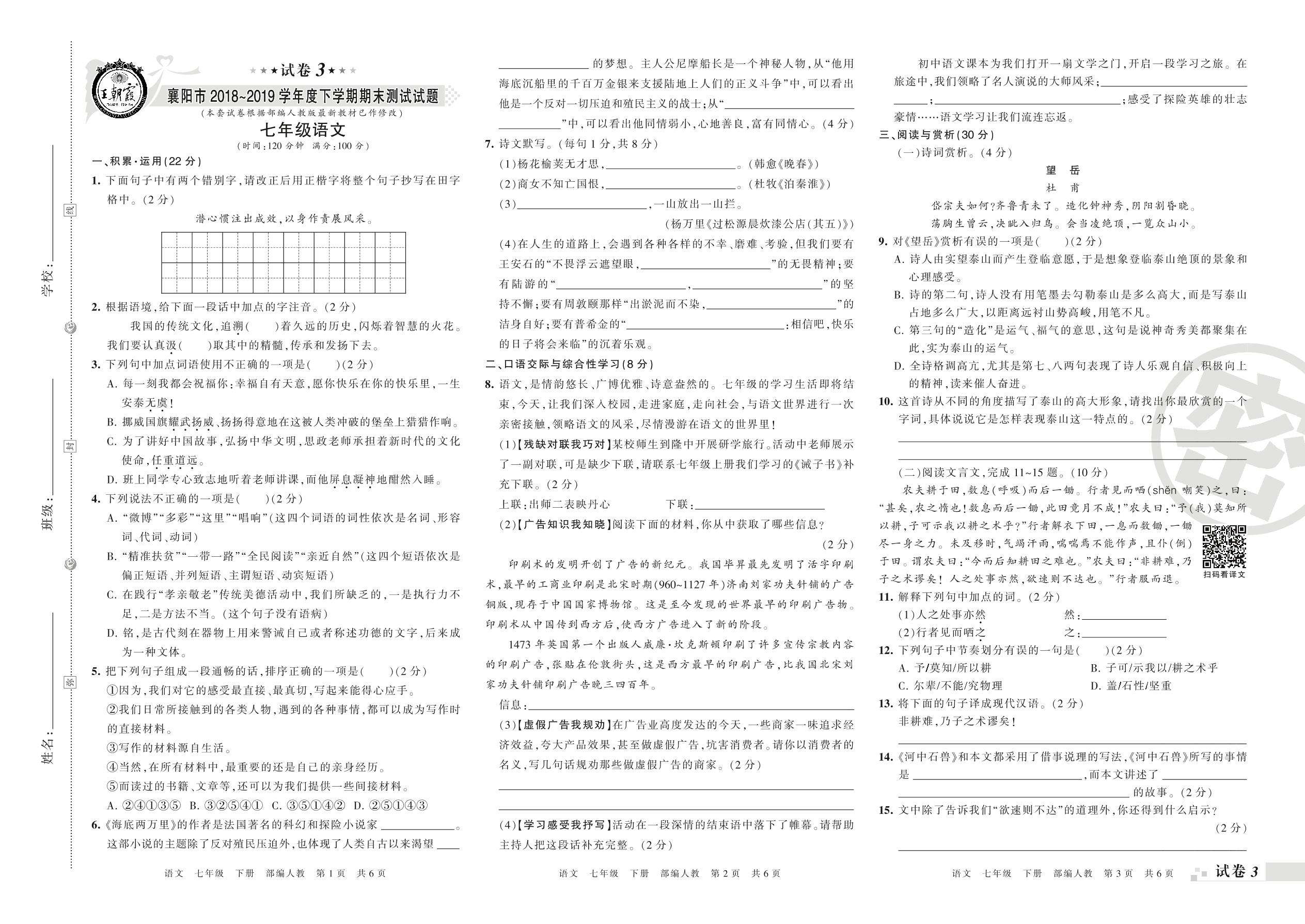 2018-2019学年第二学期襄阳市七年级语文试卷(人教版)【3】