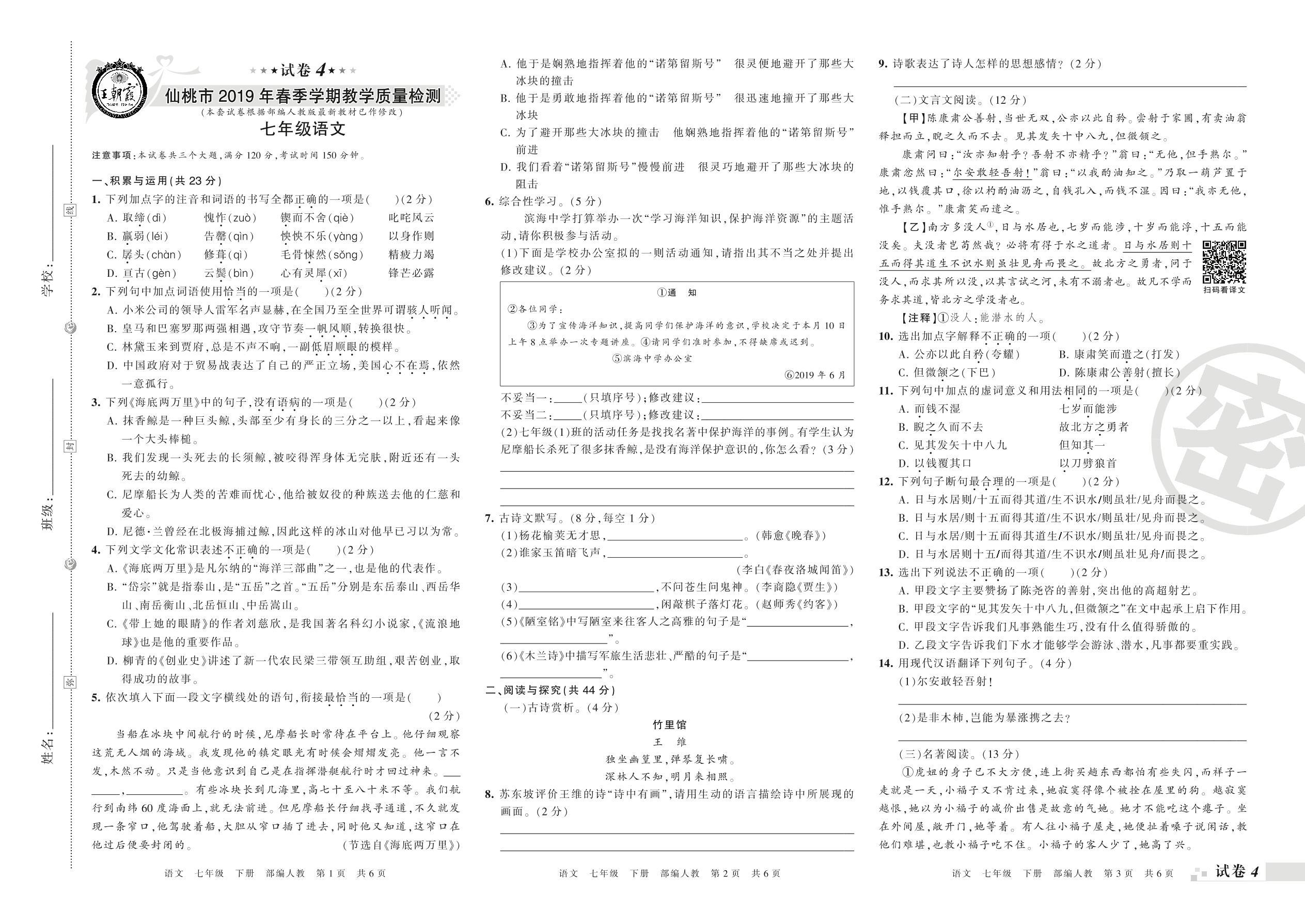 2018-2019学年第二学期仙桃市七年级语文试卷(人教版)【4】