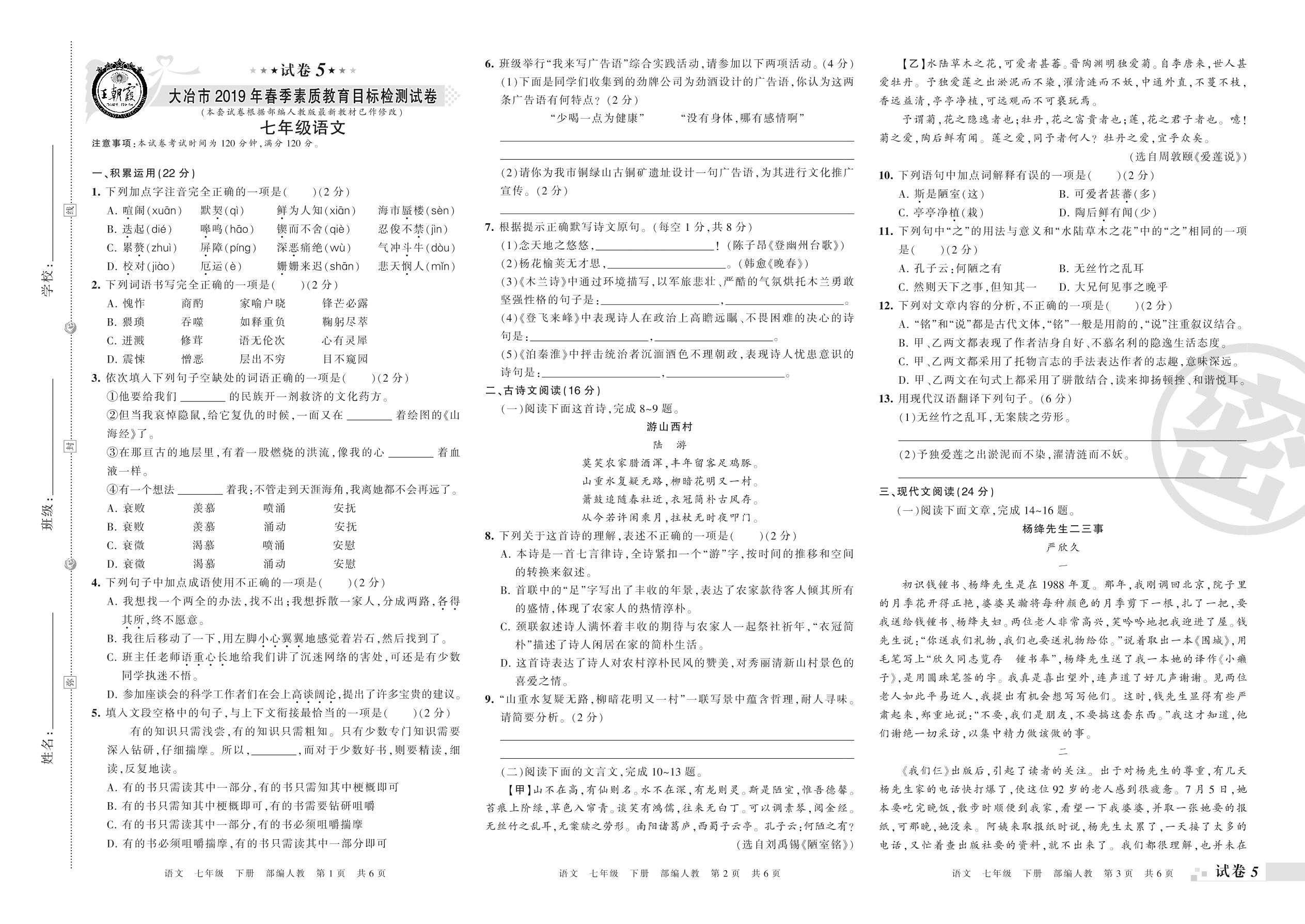 2018-2019学年第二学期大冶市七年级语文试卷(人教版)【5】