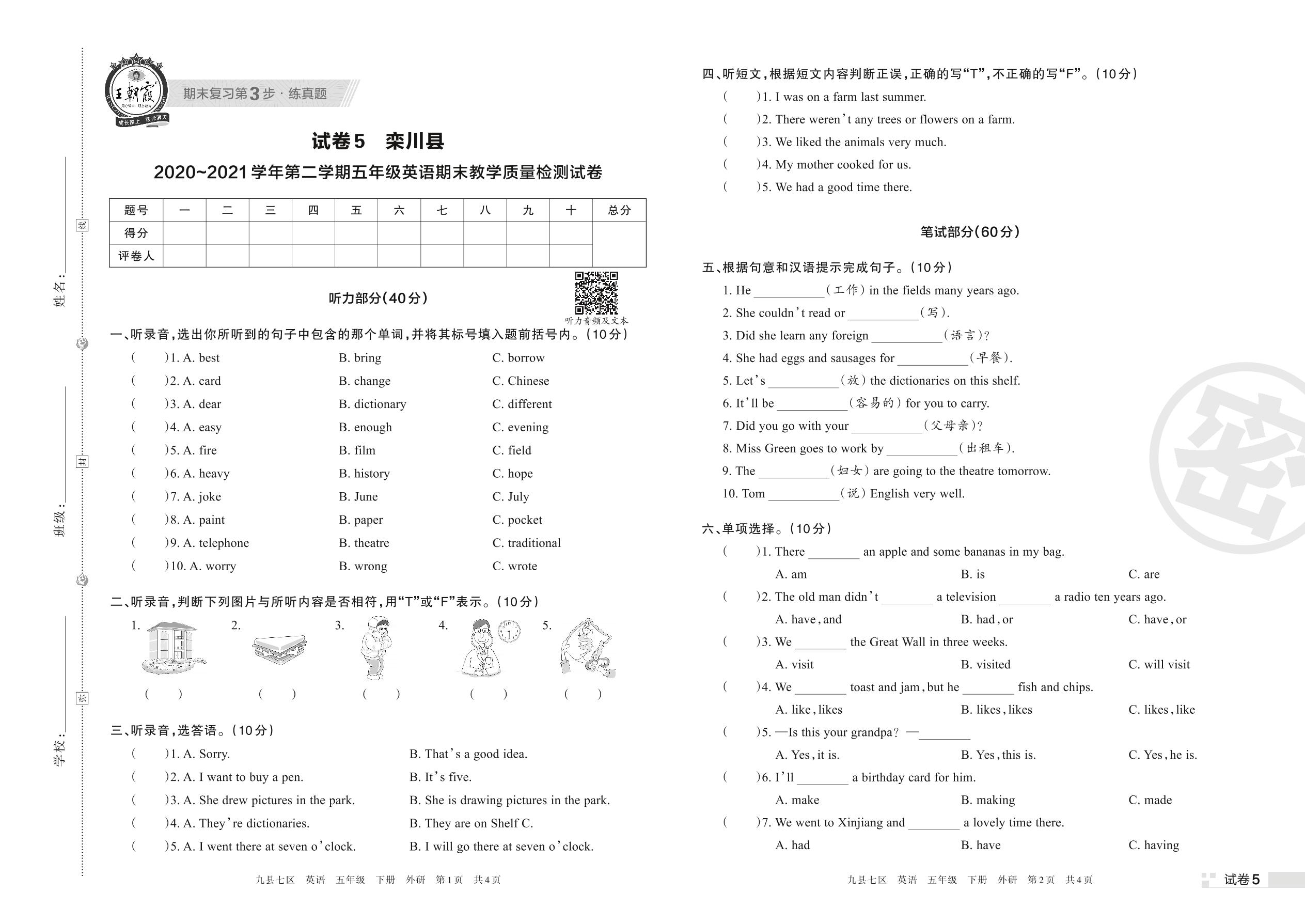 栾川县2020~2021学年第二学期五年级英语期末教学质量检测试卷(外研版)【5】