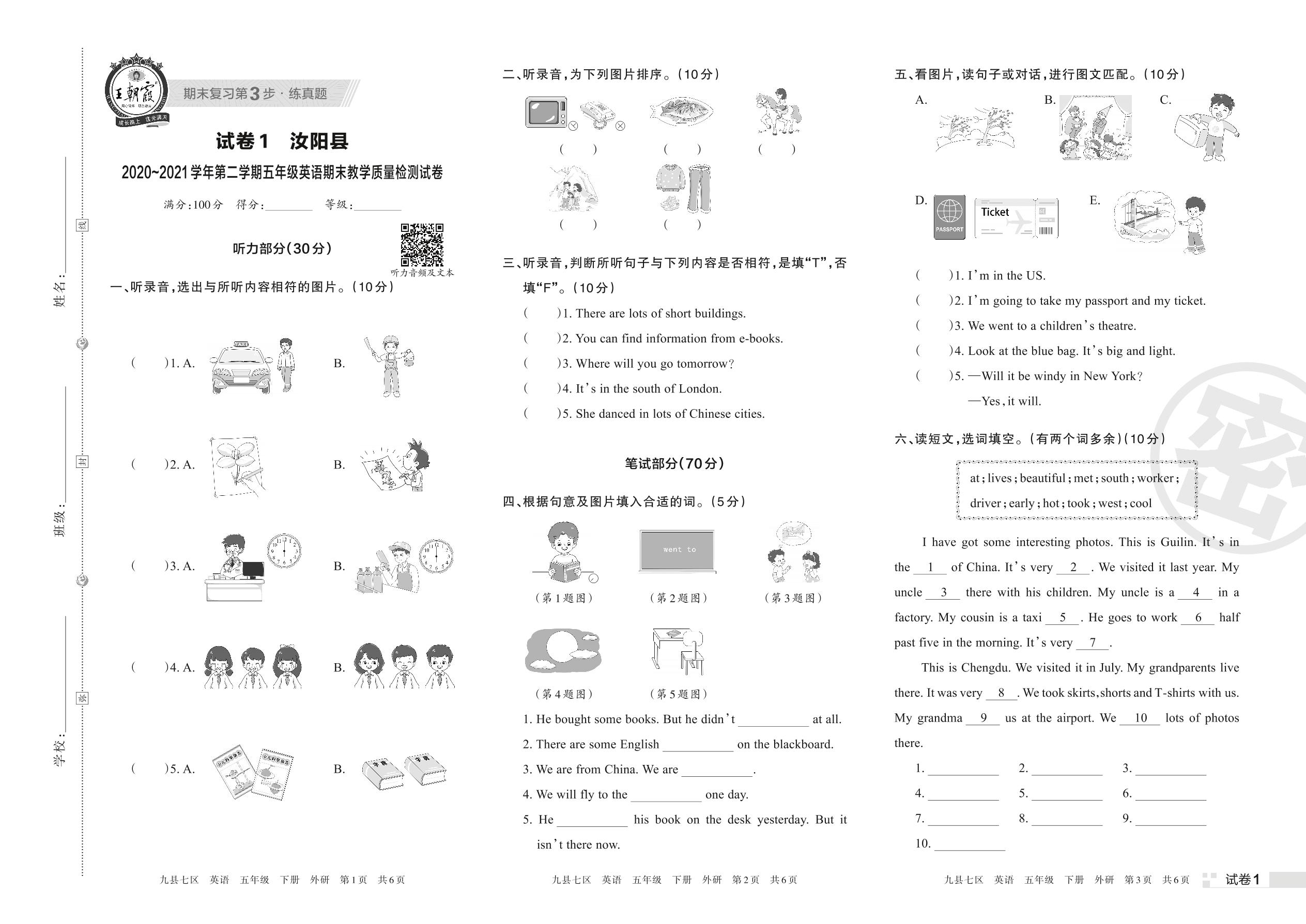 汝阳县2020~2021学年第二学期五年级英语期末教学质量检测试卷(外研版)【1】