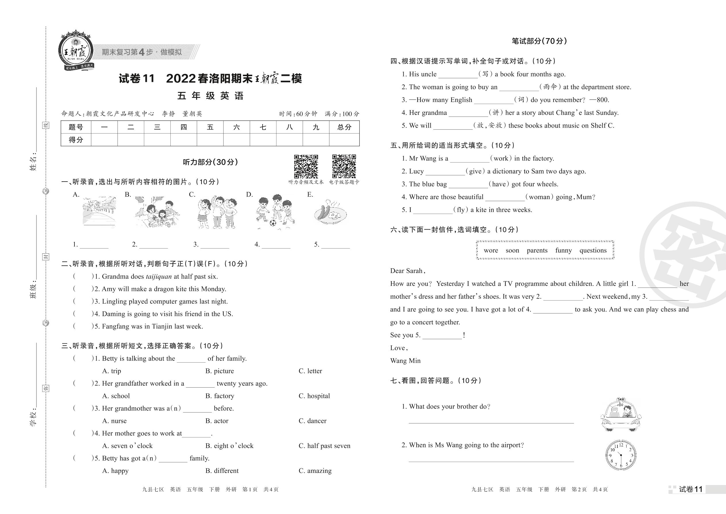 王朝霞期末模拟卷五年级下册英语(外研版)【11】