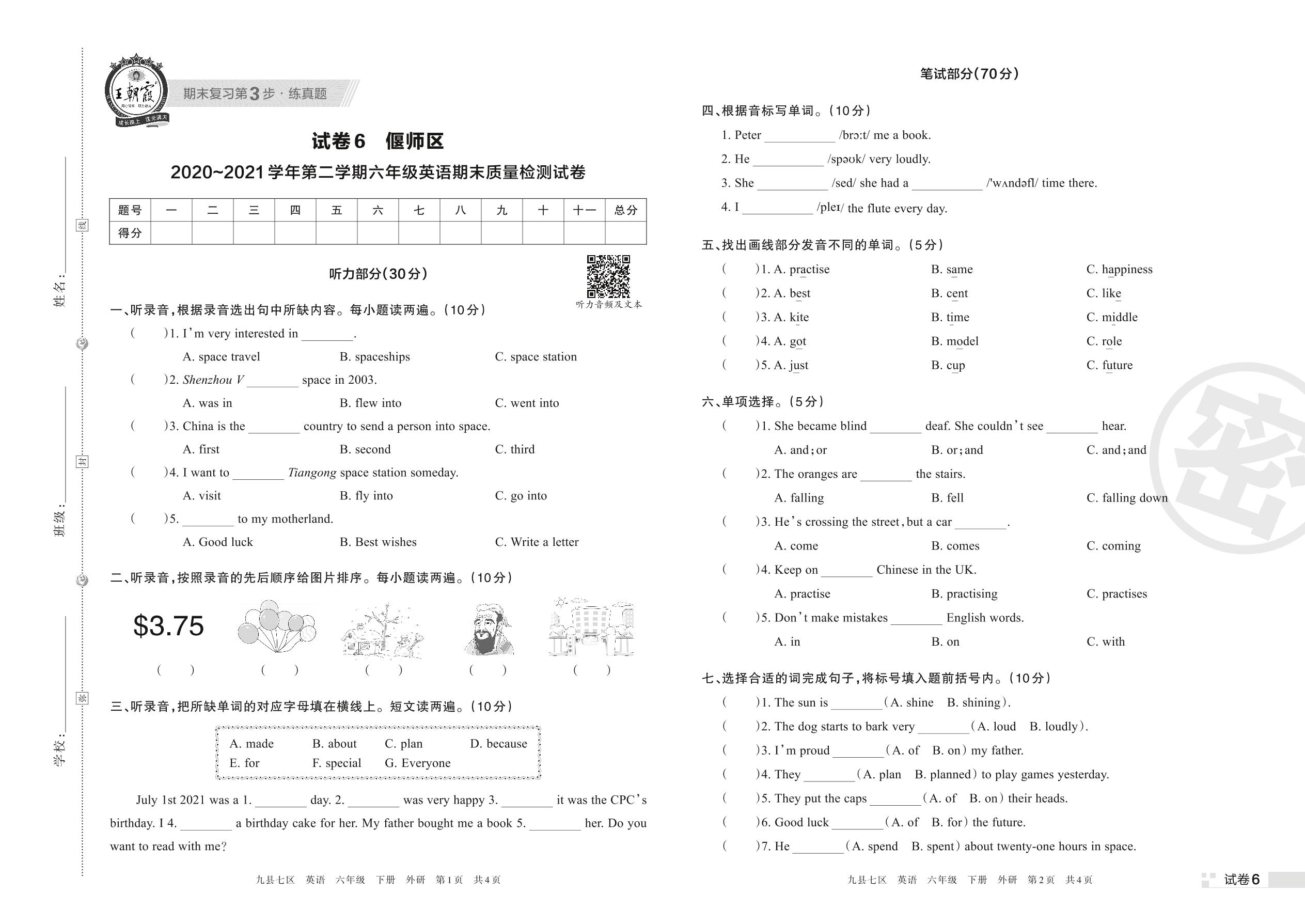 偃师区2020~2021学年第二学期六年级英语期末质量检测试卷(外研版)【6】