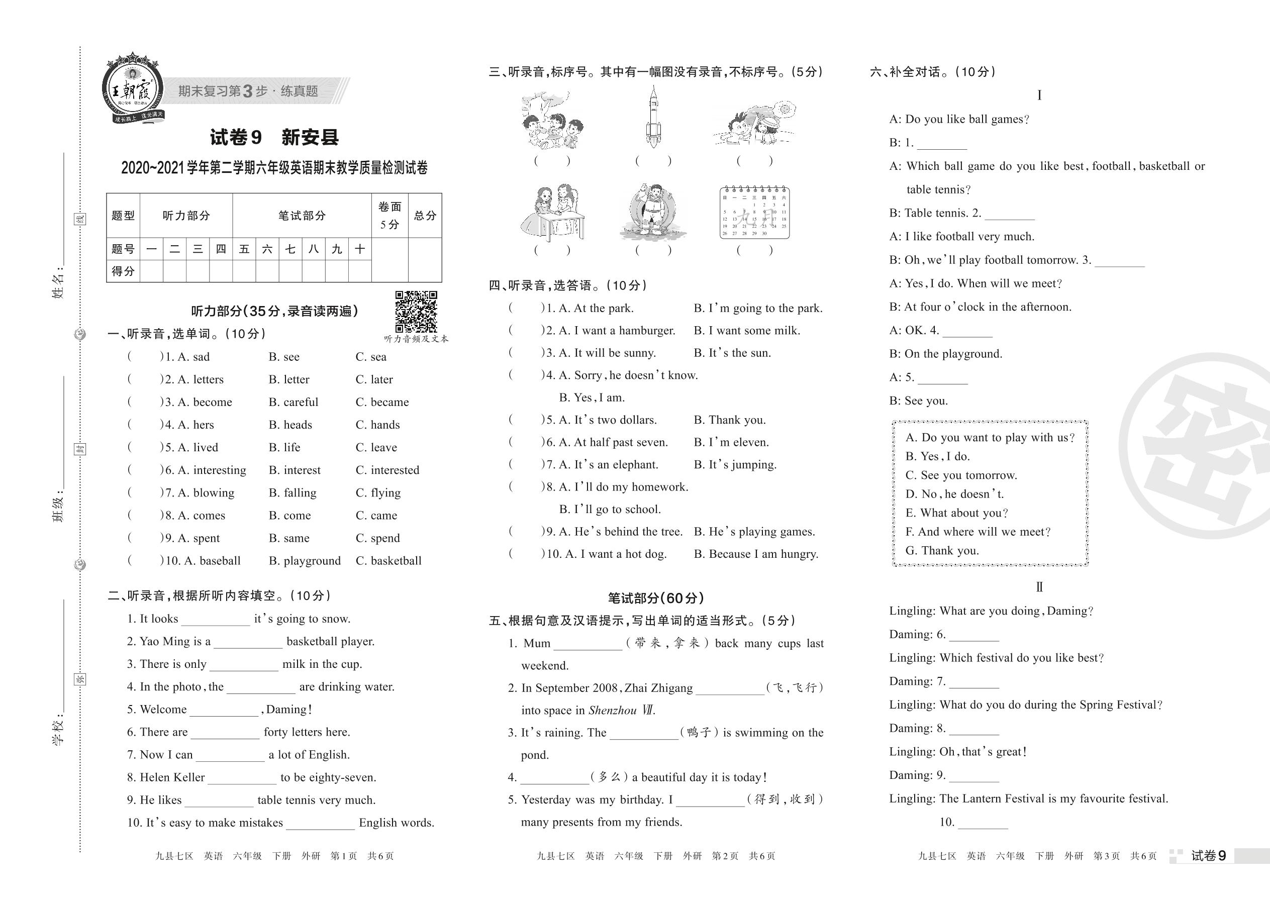 新安县2020~2021学年第二学期六年级英语期末教学质量检测试卷(外研版)【9】