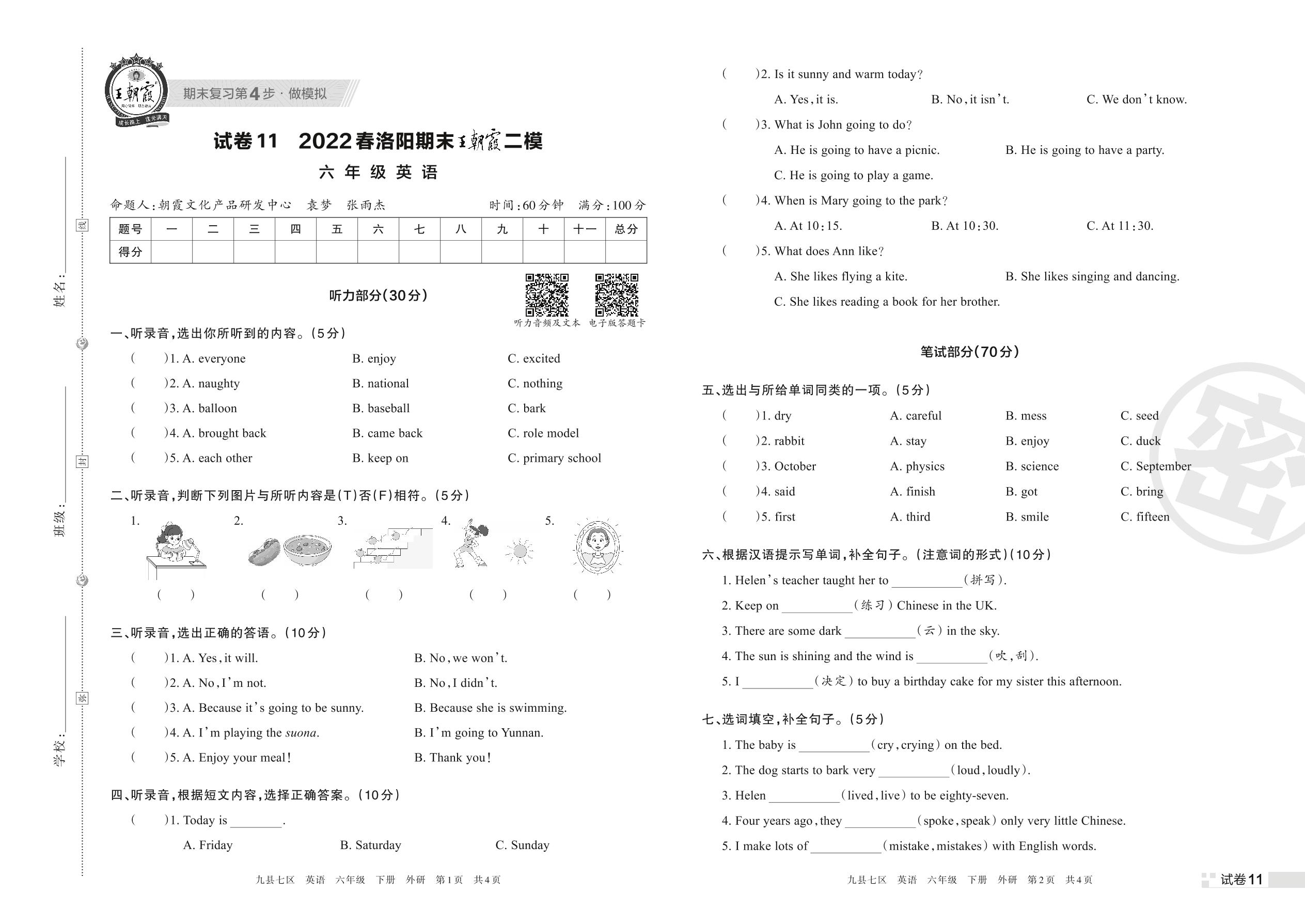 王朝霞期末模拟卷六年级下册英语(外研版)【11】