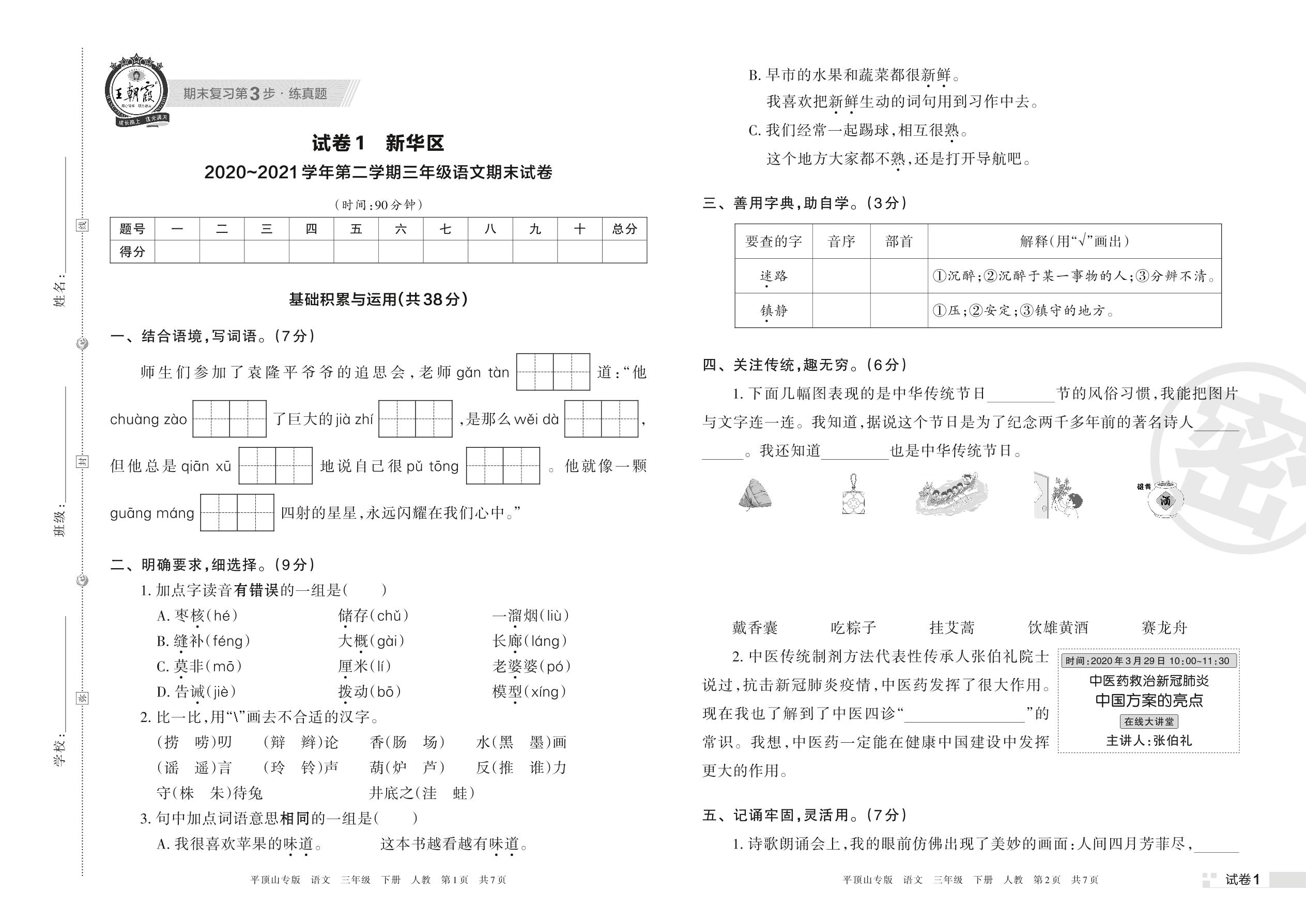 新华区2020~2021学年第二学期三年级语文期末试卷(人教版)【1】