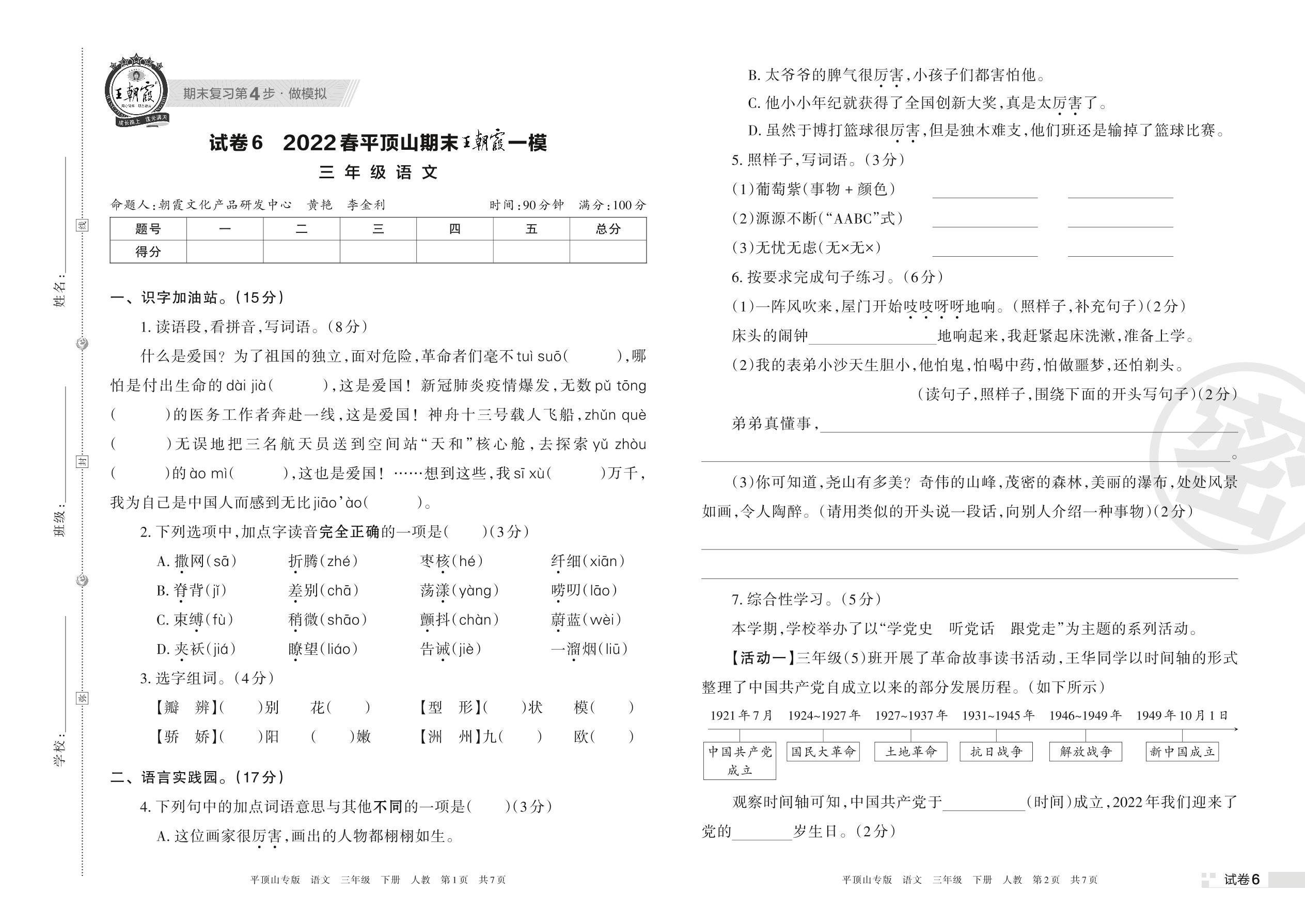 王朝霞期末模拟卷三年级下册语文(人教版)_R220408094855846【6】