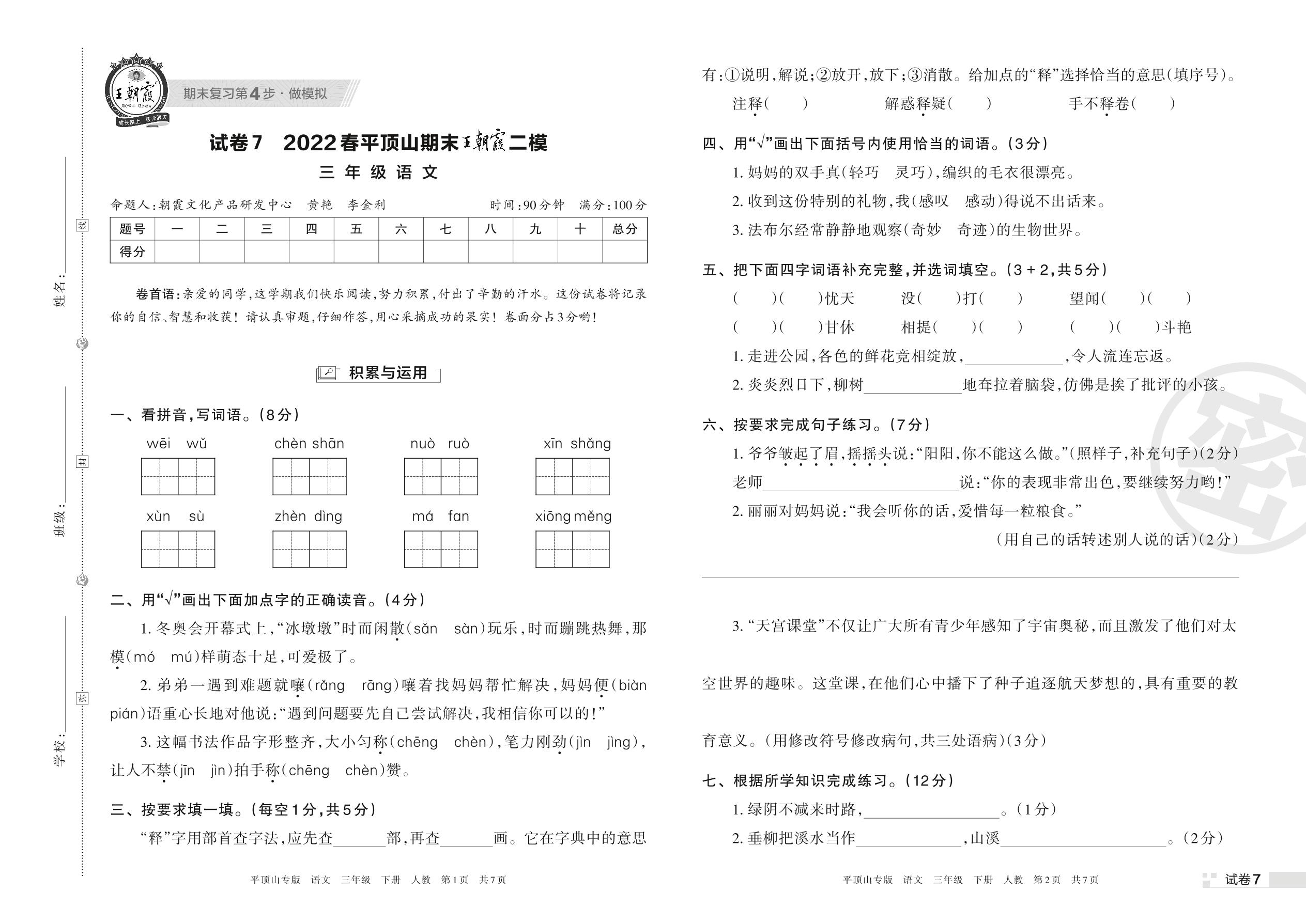 王朝霞期末模拟卷三年级下册语文(人教版)_R220408094855910【7】