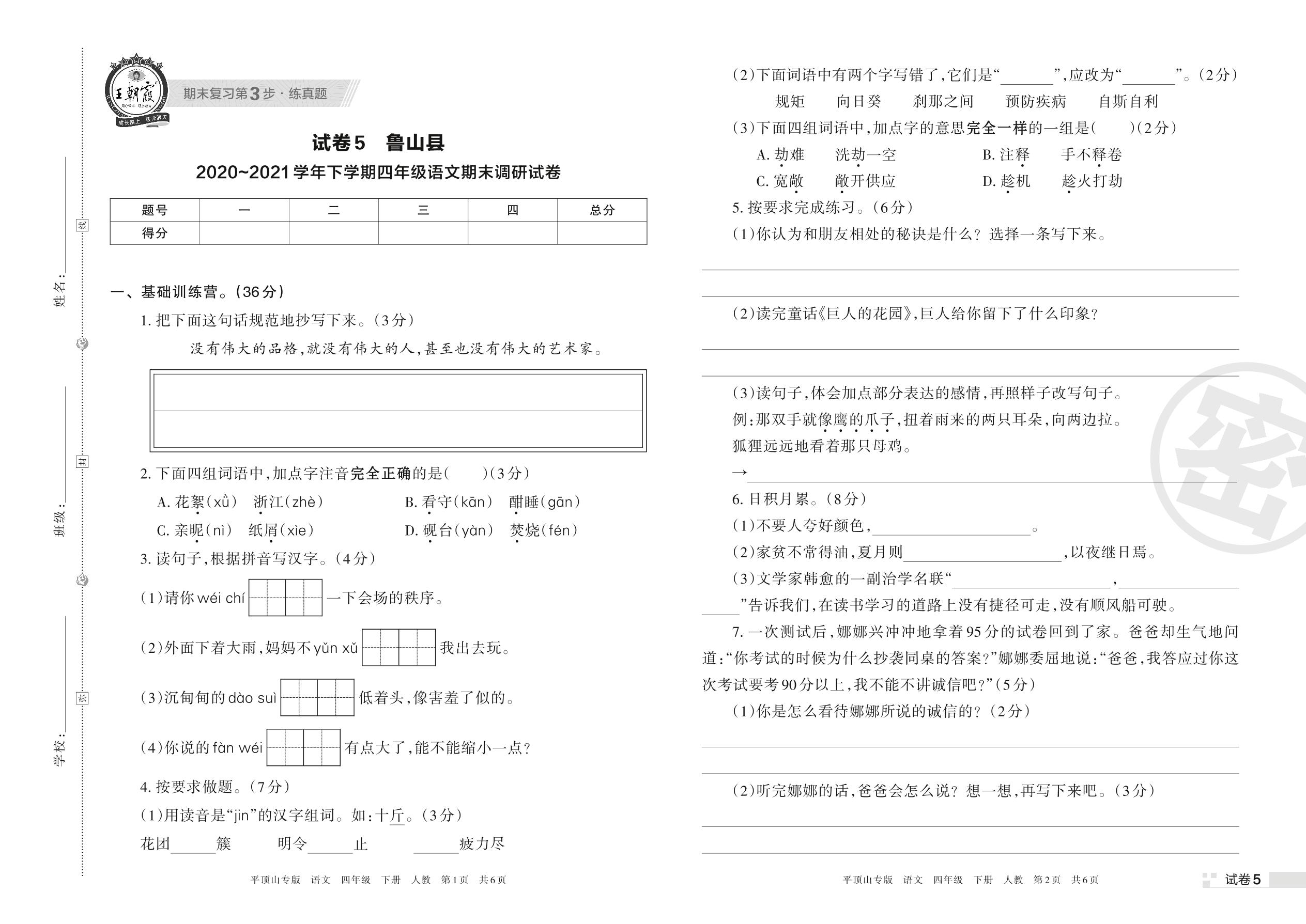 鲁山县2020~2021学年下学期四年级语文期末调研试卷(人教版)【5】