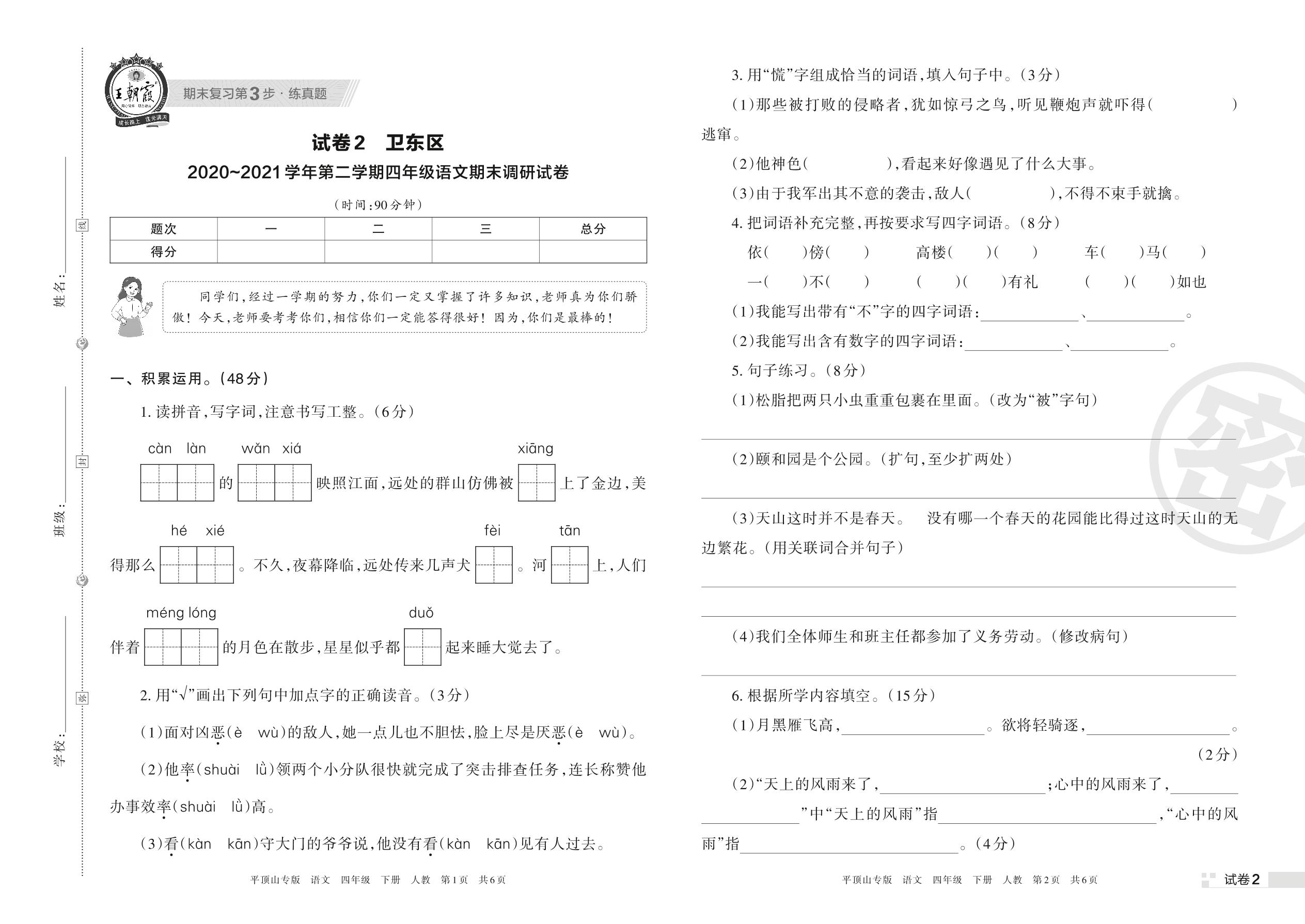 卫东区2020~2021学年第二学期四年级语文期末调研试卷(人教版)【2】