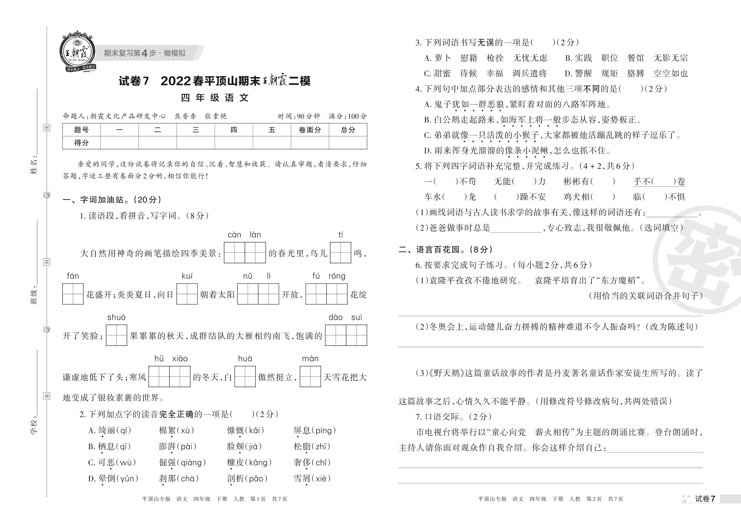 王朝霞期末模拟卷四年级下册语文(人教版)_R220408095507499【7】