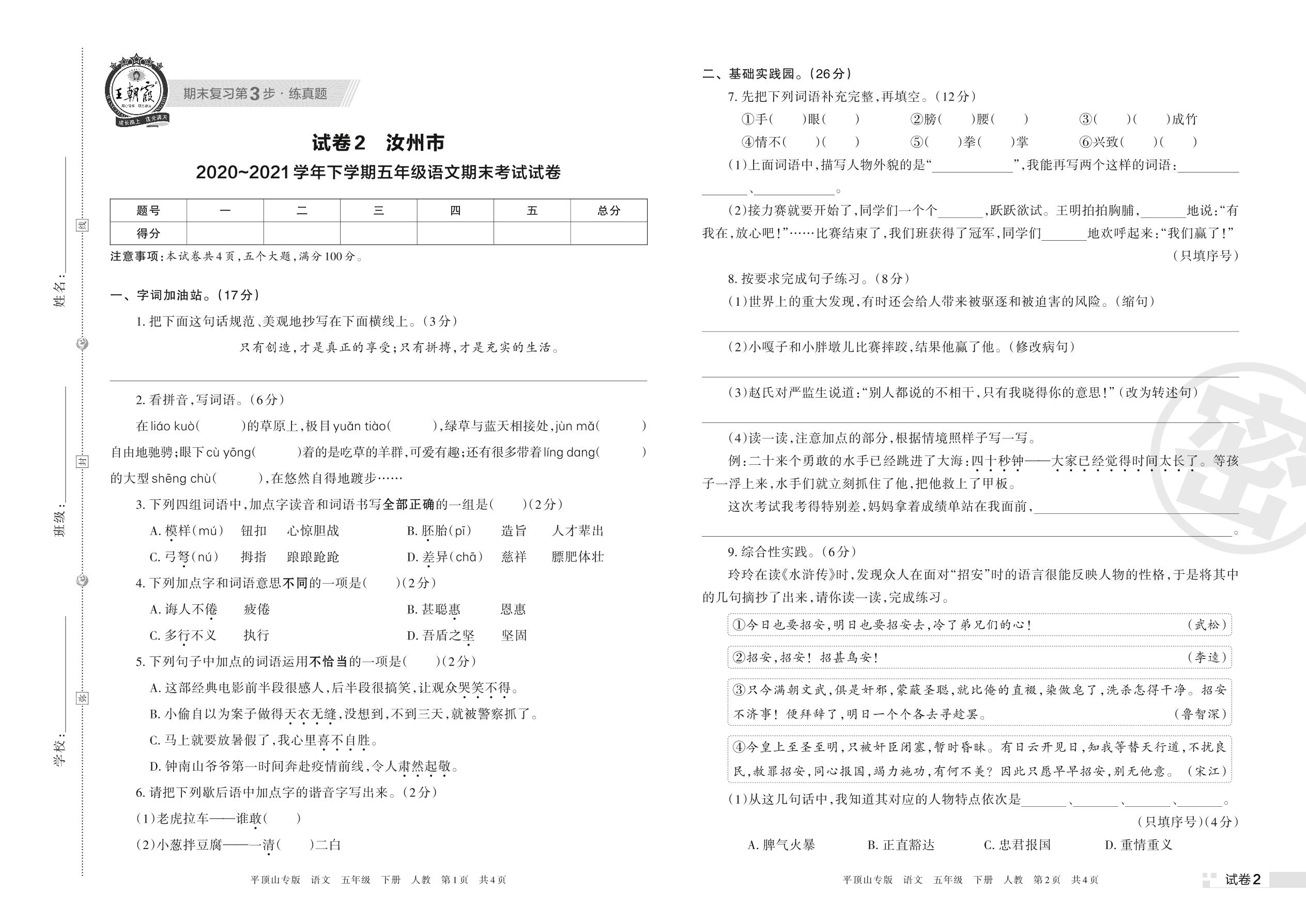 五年级语文人教版下册期末卷