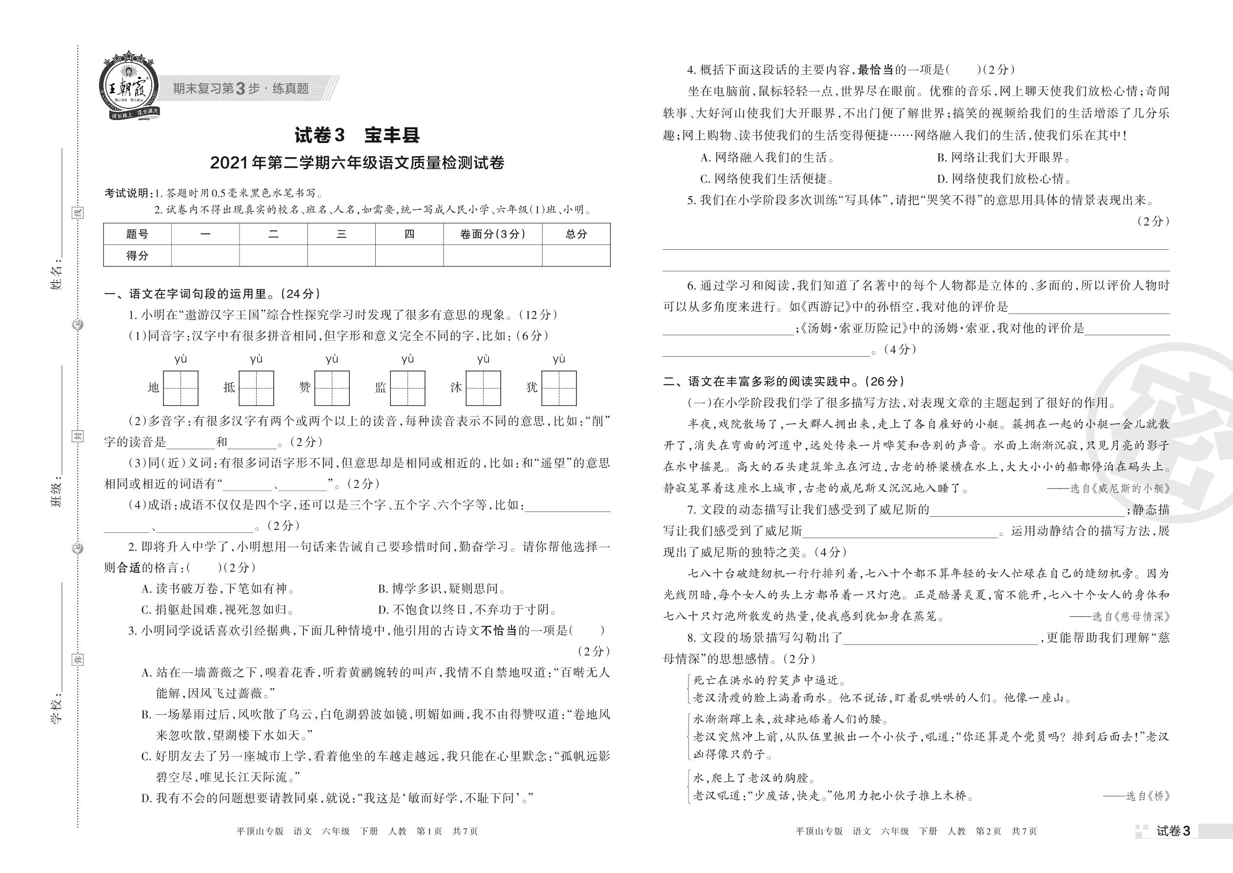 宝丰县2021年第二学期六年级语文质量检测试卷(人教版)【3】