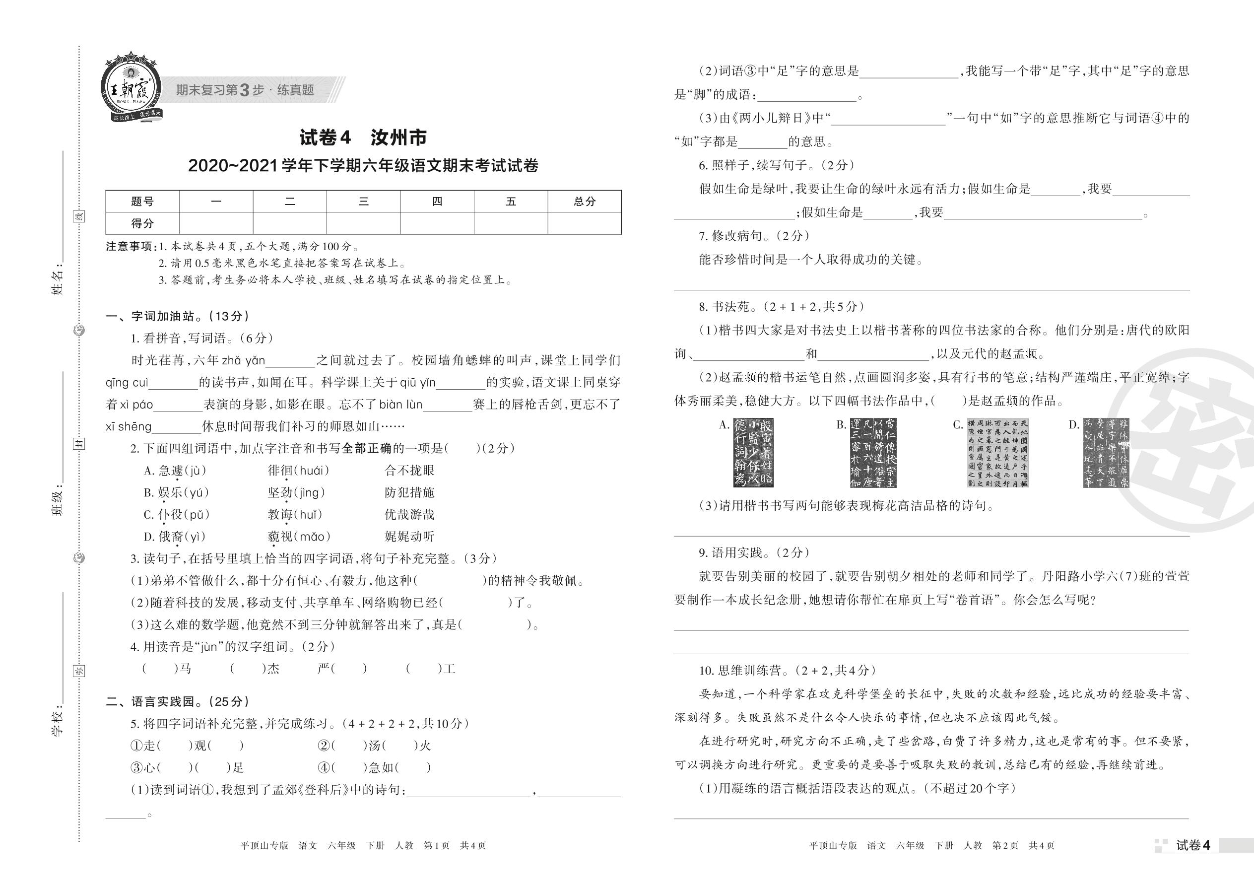 汝州市2020~2021学年下学期六年级语文期末考试试卷(人教版)【4】