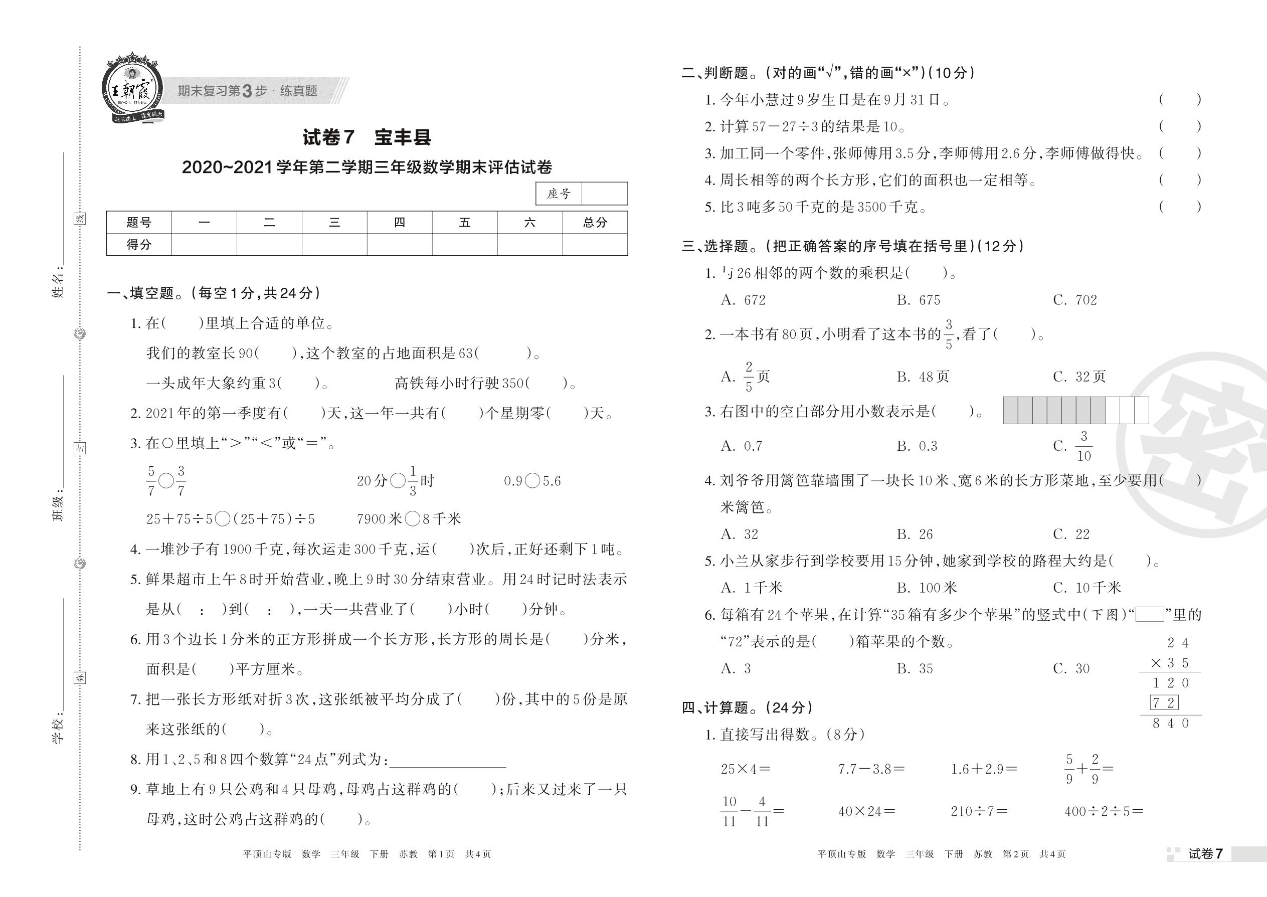 宝丰县2020~2021学年第二学期三年级数学期末评估试卷(苏教版)【7】