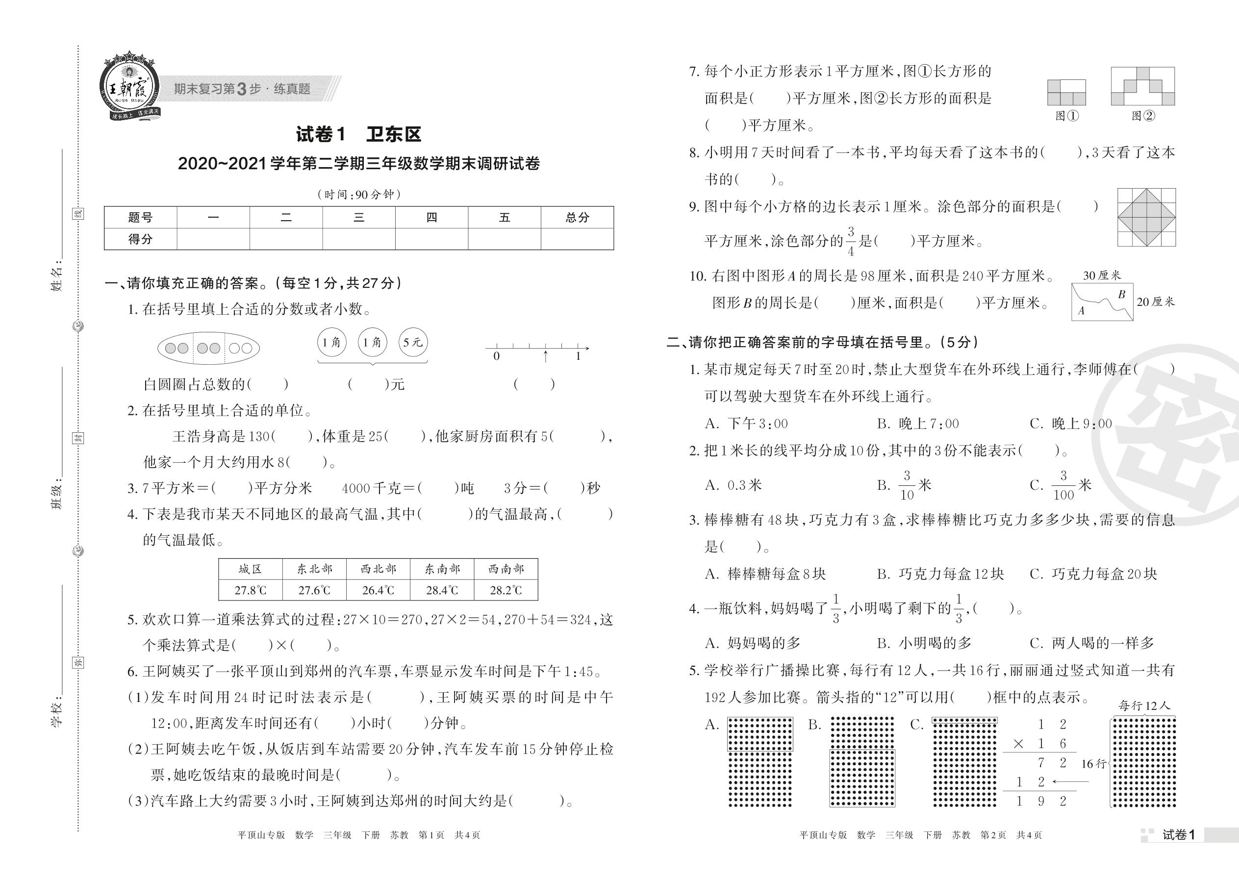 卫东区2020~2021学年第二学期三年级数学期末调研试卷(苏教版)【1】