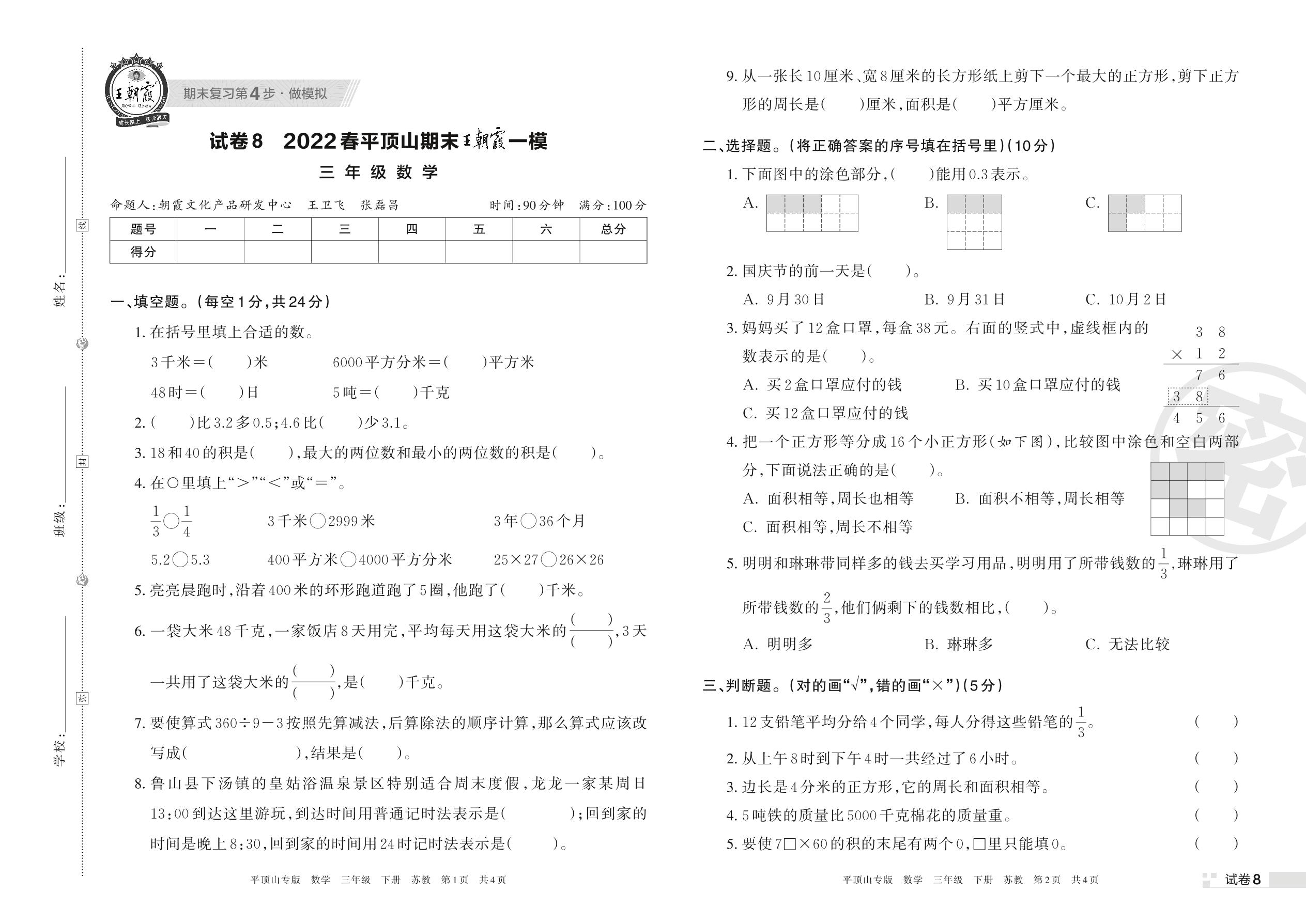王朝霞期末模拟卷三年级下册数学(苏教版)_R220408101125265【8】